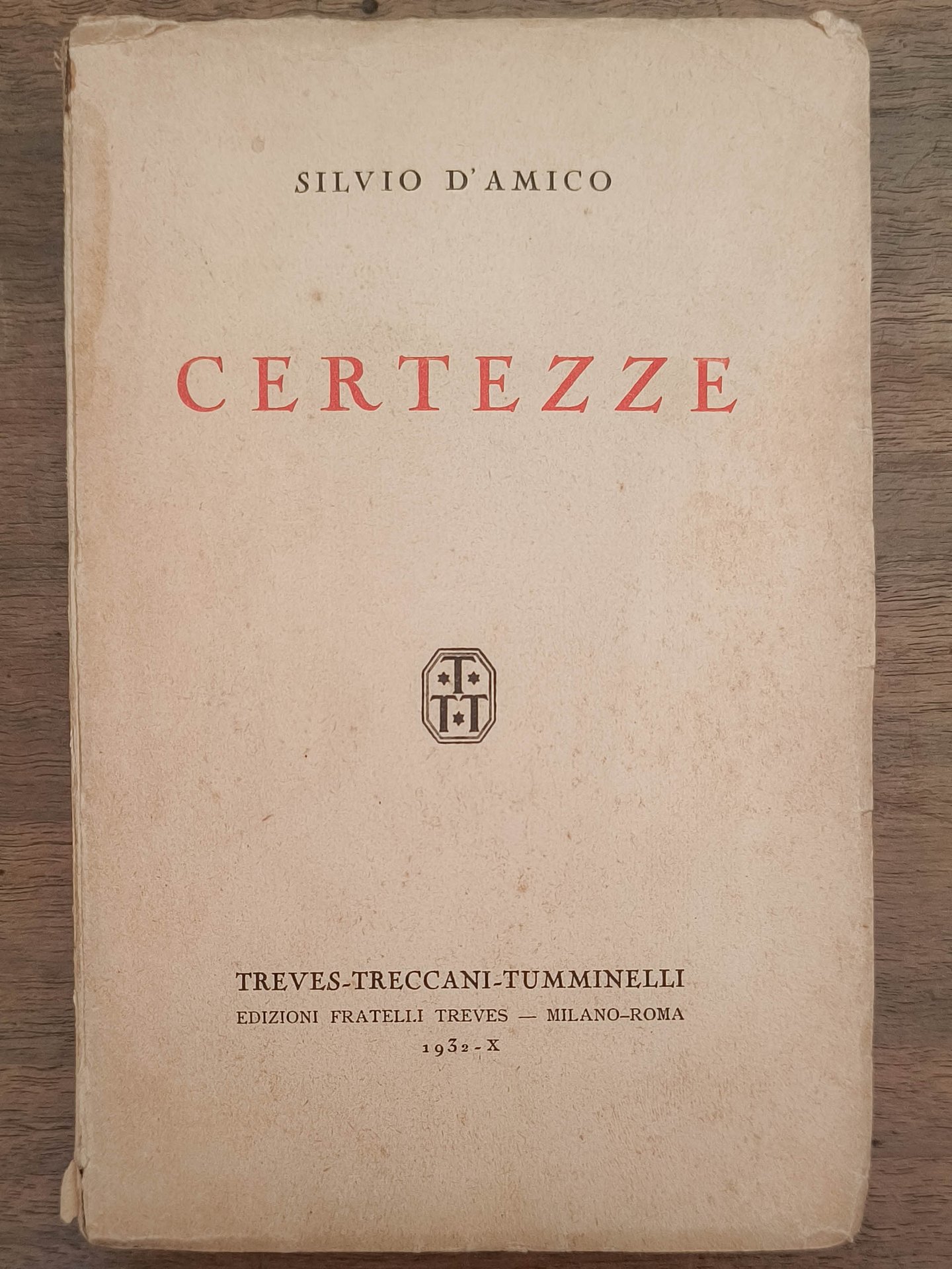 Certezze, Milano-Roma, Treves-Treccani-Tumminelli, 1932. Cm 18,5. Pp. 261. Brossura editoriale. Leggeri segni d'usura. Dedica autografa dell'autore in tre righe a Benedetto Migliore (giornalista e critico letterario).