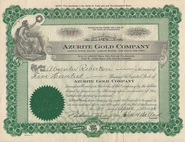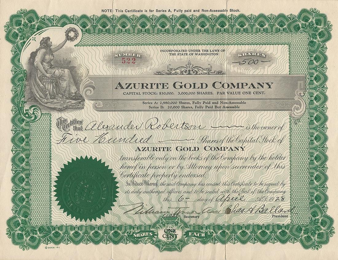 Certificato Azionario - Azurite Gold Company 1928