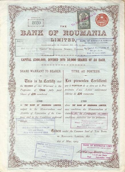Certificato Azionario - Bank of Roumania n. 8030Dimensioni: 39 x 28 cm c.a.Anno 1903Perfetto stato di conservazione generale Share Certificate - Bank of Roumania n. 8030Dimensions: 39 x 28 cm c.a.Year 1903Perfect state of general conservation Certificat d'Actions - Bank of Roumania n. 8030Dimensions: 39 x 28 cm c.a.Année 1903Parfait état de conservation générale Aktienzertifikat - Bank of Roumania n. 8030Abmessungen: 39 x 28 cm c.a.Jahr 1903Perfekter Zustand der allgemeinen Erhaltung