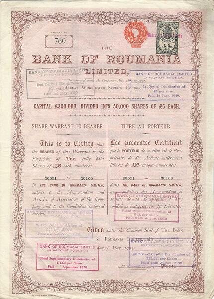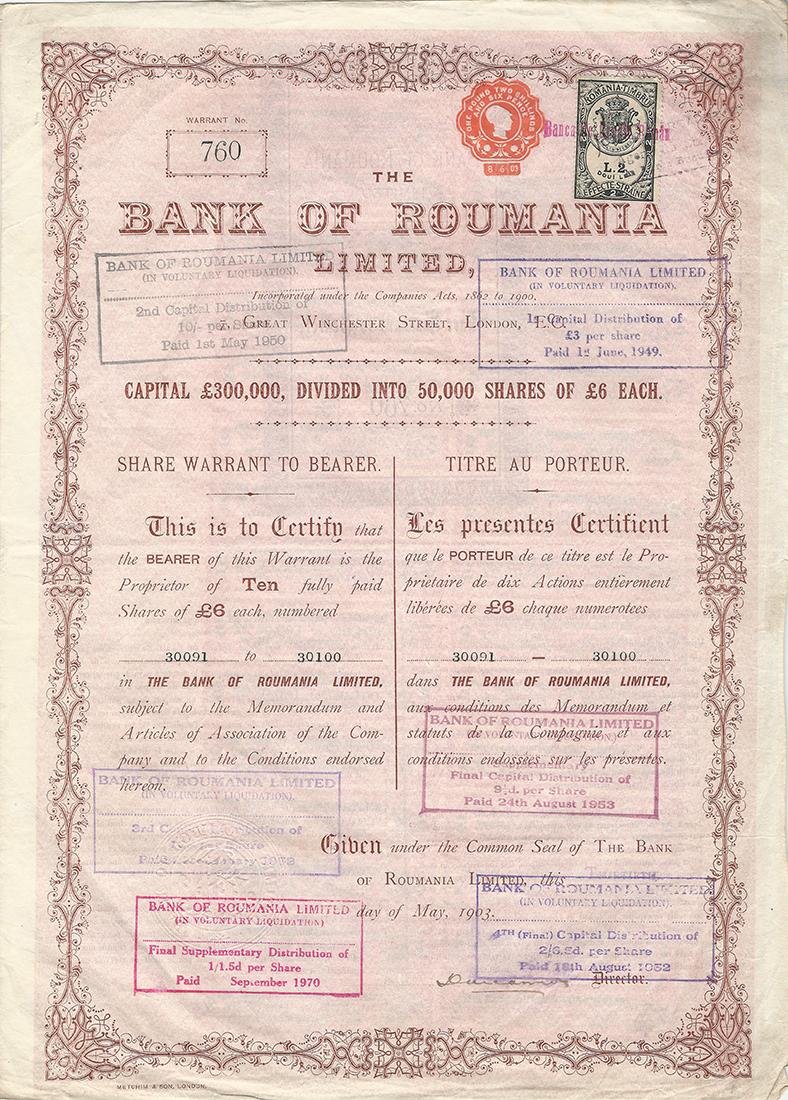 Certificato Azionario - Bank of Roumania n. 760Dimensioni: 39 x 28 cm c.a.Anno 1903Perfetto stato di conservazione generale Share Certificate - Bank of Roumania n. 760Dimensions: 39 x 28 cm c.a.Year 1903Perfect state of general conservation Certificat d'Actions - Bank of Roumania n. 760Dimensions: 39 x 28 cm c.a.Année 1903Parfait état de conservation générale Aktienzertifikat - Bank of Roumania n. 760Abmessungen: 39 x 28 cm c.a.Jahr 1903Perfekter Zustand der allgemeinen Erhaltung