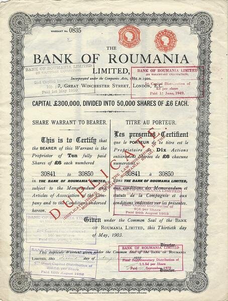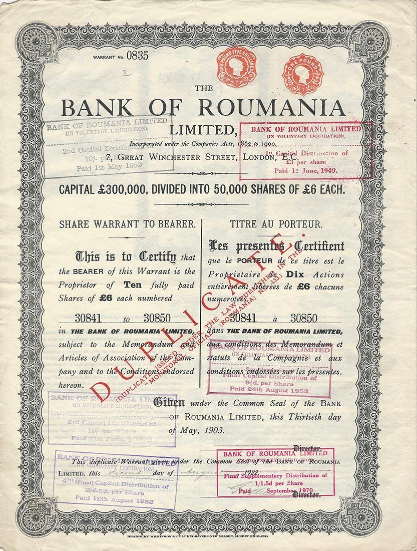 Certificato Azionario - Bank of Roumania n. 0835Dimensioni: 39 x 28 cm c.a.Anno 1903Perfetto stato di conservazione generale Share Certificate - Bank of Roumania n. 0835Dimensions: 39 x 28 cm c.a.Year 1903Perfect state of general conservation Certificat d'Actions - Bank of Roumania n. 0835Dimensions: 39 x 28 cm c.a.Année 1903Parfait état de conservation générale Aktienzertifikat - Bank of Roumania n. 0835Abmessungen: 39 x 28 cm c.a.Jahr 1903Perfekter Zustand der allgemeinen Erhaltung
