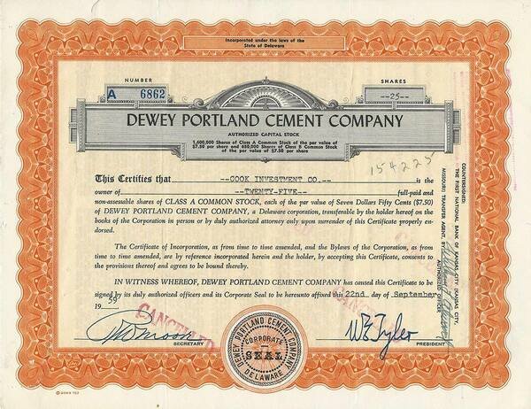 Certificato Azionario - Dewey Portland Cement Company n. A6862Dimensioni: 21,5 x 28 cm c.a. Anno 1959Perfetto stato di conservazione generale Share Certificate - Dewey Portland Cement Company n. A6862Dimensions: 21.5 x 28 cm c.a.Year 1959Perfect state of general conservation Certificat d'actions - Dewey Portland Cement Company n. A6862Dimensions: 21,5 x 28 cm c.a.Année 1959Parfait état de conservation générale Aktienzertifikat - Dewey Portland Cement Company n. A6862Abmessungen: 21,5 x 28 cm c.a.Jahr 1959Perfekter Zustand der allgemeinen Erhaltung