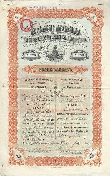 Certificato Azionario - East Rand Proprietary Mines, Limited n. A15273Dimensioni: 25 x 39,5 cm c.a.Anno 1927Perfetto stato di conservazione generale Share Certificate - East Rand Proprietary Mines, Limited n. A15273Dimensions: 25 x 39.5 cm c.a.Year 1927Perfect state of general conservation Certificat d'actions - East Rand Proprietary Mines, Limited n. A15273Dimensions: 25 x 39,5 cm c.a.Année 1927Parfait état de conservation générale Aktienzertifikat - East Rand Proprietary Mines, Limited n. A15273Abmessungen: 25 x 39,5 cm c.a.Jahr 1927Perfekter Zustand der allgemeinen Erhaltung