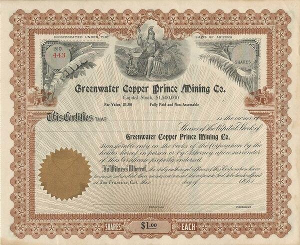 Certificato Azionario - Greenwater Copper Prince Mining Co.
