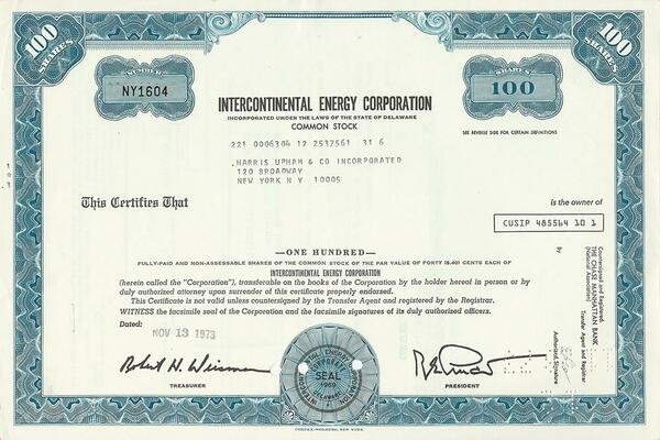 Certificato Azionario - Intercontinental Energy Corporation n. NY1604Dimensioni: 02,5 x 30,5 cm c.a.Anno 1973Perfetto stato di conservazione generale Share Certificate - Intercontinental Energy Corporation n. NY1604Dimensions: 02.5 x 30.5 cm c.a.1973Perfect state of general conservation Certificat d'actions - Intercontinental Energy Corporation n. NY1604Dimensions: 02,5 x 30,5 cm c.a.1973Parfait état de conservation générale Aktienzertifikat - Intercontinental Energy Corporation n. NY1604Abmessungen: 02,5 x 30,5 cm c.a.1973Perfekter Zustand der allgemeinen Erhaltung