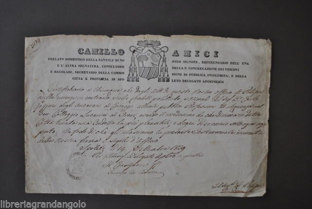 Vedere la descrizione dettagliata Certificato di buona condotta Camillo Amici Delegato apostolico della Città e della provincia di Spoleto Certifichiamo a chiunque.che il dr. Carlo Gazzoni degli Ancarani di Correggio.ha tenuto una condotta più che plausibile. Spoleto 19 settembre 1829 Firma del segretario Foglio con titoli e stemma del Vescovo Amici a stampa, per il resto manoscritto. Firma del segretario, timbro della polizia. Dimensioni: 21,5x33 cm. Condizioni di conservazione Esemplare in buono stato di conservazione con leggere tracce d'uso e del tempo. Minimi danni e bruniture ai margini. Pieghette. Minime mancanze.Certificato di buona condotta. Professore di Correggio attivo a Spoleto. Per altri volumi e documenti su questo e altri argomenti visitate il nostro negozio Libreria Grandangolo" Data l'importanza delle 5 stelle rilasciate durante l'assegnazione del feedback, invitiamo tutti gli acqirenti, se soddisfatti del loro acquisto, a rilasciare tutte le 5 stelle. La mancanza anche solo di una stella illuminata è molto lesiva per noi venditori professionali. Grazie! CONDIZIONI DI VENDITA Spedizione Fino a 5 kg piego di libri raccomandato, oltre i 5 kg pacco postale. Si ricorda che l'imballo viene eseguito con la massima cura. La merce viene spedita a pagamento avvenuto e viaggia a rischio e pericolo dell'acquirente. Per maggiori informazioni vedi la pagina SPEDIZIONI del nostro negozio. Ritiro diretto Siamo disponibili per il ritiro diretto a Modena e a Milano. Per gli indirizzi delle sedi vedi la pagina DOVE SIAMO del nostro negozio. Acquisti multipli Se si acquistano più libri, la spedizione si paga una sola volta, purché si rispettino gli scaglioni di peso. Estero / Foreign For international shipment, please contact us. Metodo di pagamento Pay Pal, bonifico bancario, versamento postale (cc/p, vaglia o altro). La spedizione avverrà entro i primi 4 giorni lavorativi dopo la conferma di avvenuto pagamento. Si emette ricevuta fiscale e a richiesta fattura. Il pagamento deve essere effettuato entro 7 giorni lavorativi dalla data di acquisto, trascorsi i quali l'oggetto sarà rimesso in vendita. Feedback Viene rilasciato dall'acquirente dopo il ricevimento di quanto acquistato. Data la sua importanza, vi invitiamo a leggere il breve testo della pagina FEEDBACK del nostro negozio. Pertanto, in caso di qualsiasi problema, non esitate a contattarci. Diritto di recesso L'acquirente ha il diritto di restituire l'oggetto entro 14 giorni ed essere rimborsato, escluse le spese di porto e imballo. L'oggetto deve essere restituito, dopo previa comunicazione, imballato e nelle medesime condizioni di come era all'origine. Creato da Turbo Lister Strumento gratuito per mettere in vendita i tuoi oggetti. Metti in vendita i tuoi oggetti in modo facile e veloce e gestisci le inserzioni in corso. "