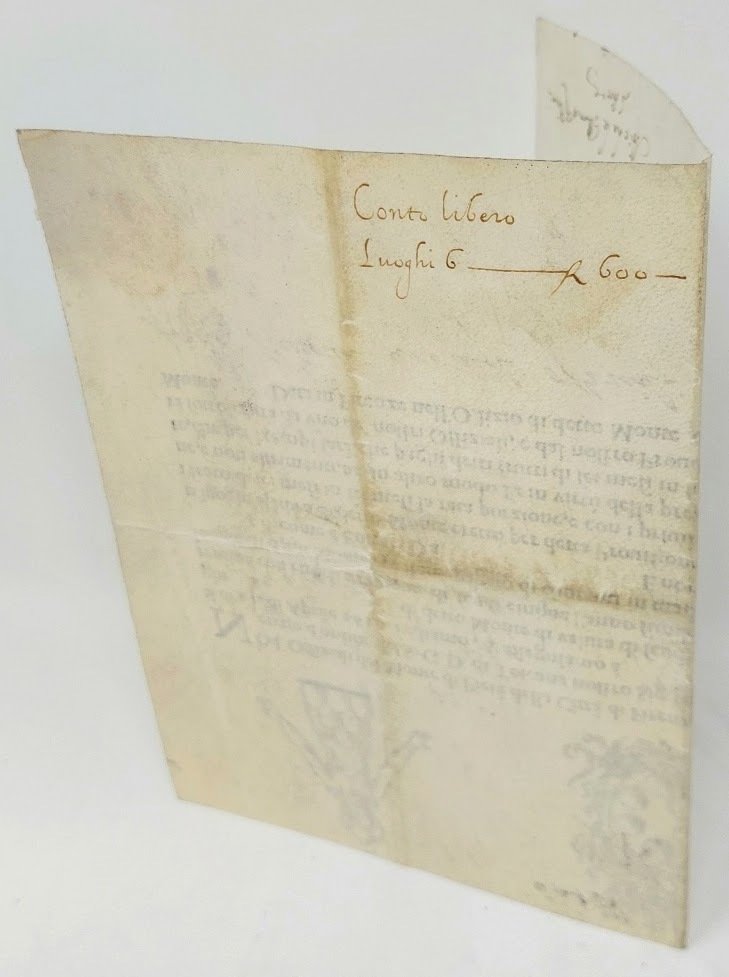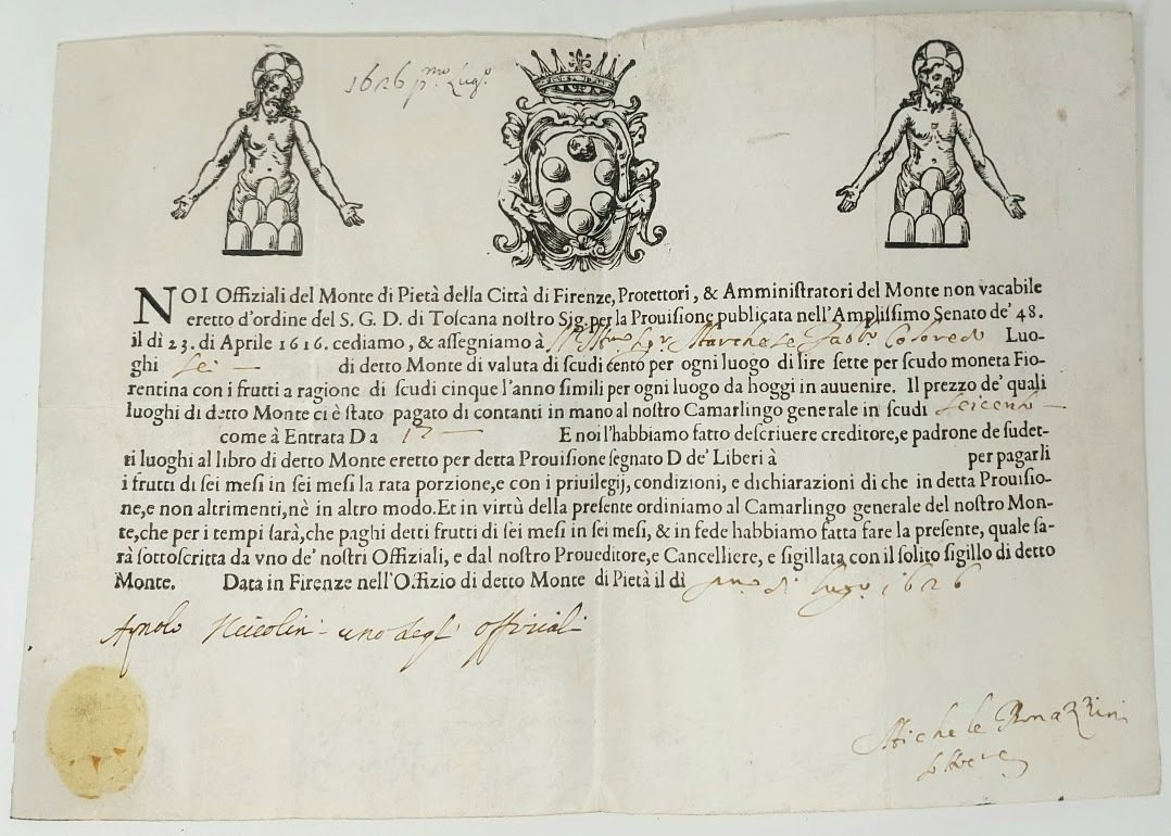 >titolo azionario (mm192x280) in pergamena leggera, piegato a metà, impresso a stampa e compilato a mano a benficio del Marchese Fabrizio Colloredi, con firme degli ufficiali del Monte di Pietà: ''Agnolo Niccolini uno degli Offiziali''. Nella parte superiore si trovano le incisioni dello stemma dei Medici (al centro), affiancata ai lati da quella del Cristo con i ''monti'', traccia di sigillo all'angolo inf. sinistro. Al recto del documento scritta ms.; ''Conto Libero, Luoghi 6___600-''. Rarissimo documento bancario rilasciato dal Monte di Pietà della Città di Firenze nel 1626. I Monti di Pietà nascono in epoca medievale per contrastare l'egemonia ebraica nella pratica del prestito di denaro. A partire dal sedicesimo secolo i banchi di credito ricevevano anche depositi dai cittadini sotto forma di Luoghi (termine che corrisponde circa al concetto di titolo azionario), con l'evoluzione dei Monti verso dei veri e propri sistemi bancari, queste istituzioni svolgevano sia funzioni di prestito che di deposito, come nel presente esemplare. L'ammontare in denaro dei Luoghi era sempre alto e nel caso del Monte di Pietà della città di Firenze corrispondeva a 100 scudi, per ciascun Luogo si riceveva un interesse (frutti) di cinque scudi annui, da riscuotere presso gli Ufficiali del Monte di sei mesi in sei mesi. I Luoghi potevano inoltre essere di due tipi, ''vacabili'' se venivano rimborsati alla morte del montista (caso in cui rappresentavano una pura rendita vitalizia) o ''non vacabili'', come il presente, quando erano riscattabili prima della data prevista (come dei veri e propri titoli azionari). Questi certificati di deposito possono considerarsi a buon diritto i più antichi documenti bancari italiani. Esemplare perfetto, rarissimo specie in questo impeccabile stato di conservazione.
