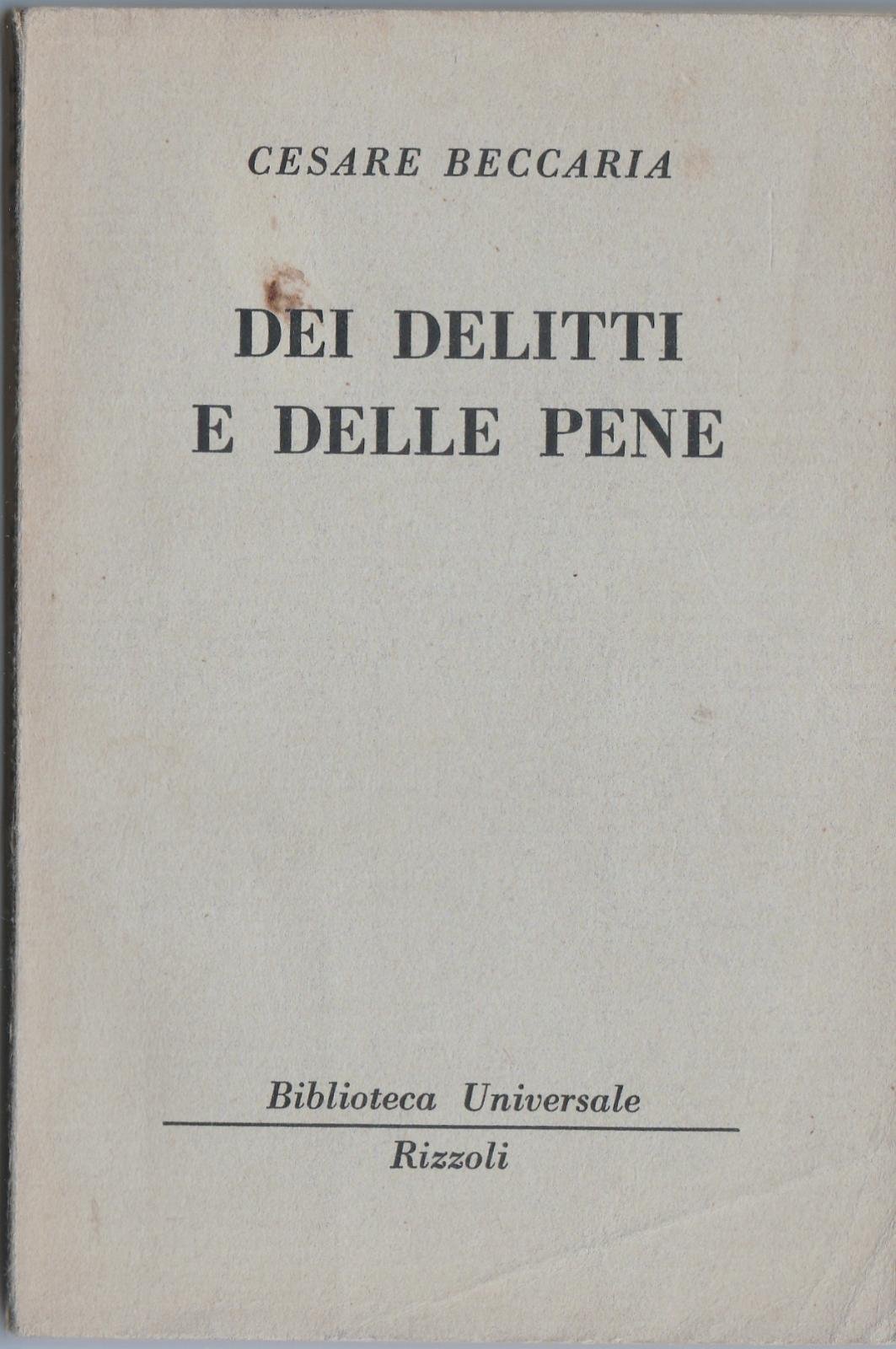 CESARE BECCARIA DEI DELITTI E DELLE PENE BIBLIOTECA UNIVERSALE RIZZOLI NUMERO 123 1∞ EDIZIONE 1950 5984 COPERTINA MORBIDA EDITORIALE CON UNA VISTOSA MACCHIA VICINO AL TITOLO AL PIATTO ANTERIORE LIEVE BRUNITURA A LIVELLO DELLA CERNIERA ALCUNE PICCOLE MACCHIE PIATTI, TAGLI LEGGERMENTE INGIALLITI ANTIPORTA FIRMA E DATA DI POSSESSO PENNA ROSSA INTERNO IN BUONO STATO UNA PIEGA ALL'ANGOLO INFERIORE DA PAGINA 51 A PAGINA 54 NUMERO PAGINE 95 DIMENSIONI CM 15,5 X 10,5