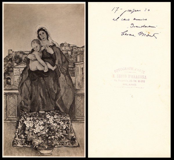 fotografia di un'opera di Cesare Monti con dedica e firma al retro a Branduani datata 17 Giugno 1930 dello studio fotografico E. Secco d'Aragona Milano formato 12,5X22,8 cm circa; buon es.