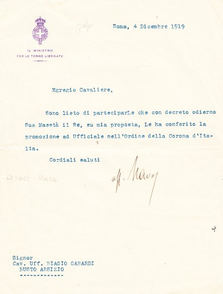 comunicazione firmata di Cesare Nava su carta intesta "Il Ministro per le Terre Liberate" datata Roma, 4 Dicembre 1919; buon es.