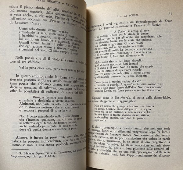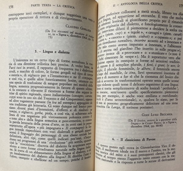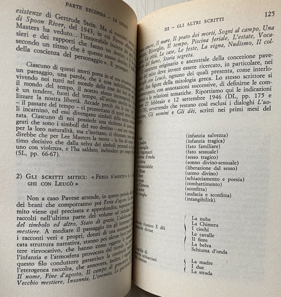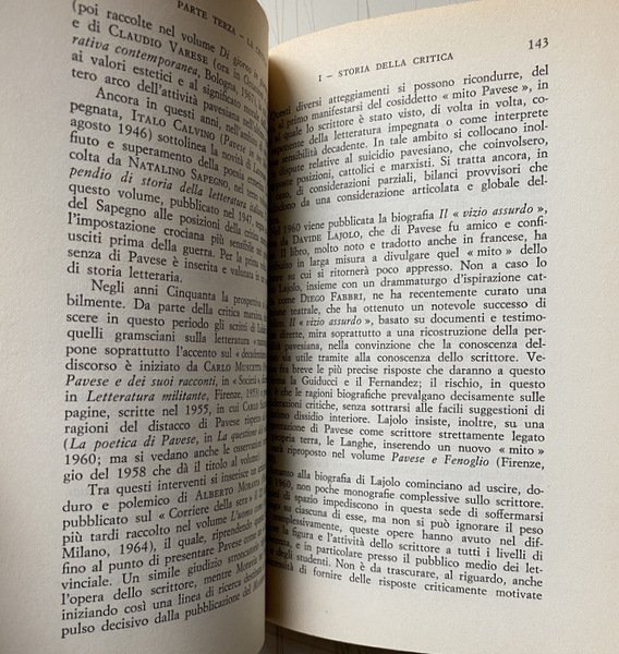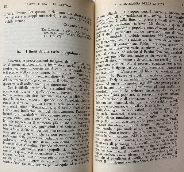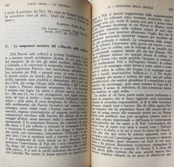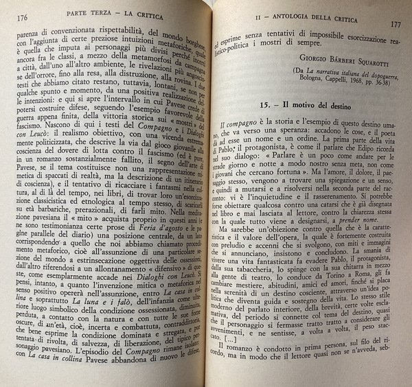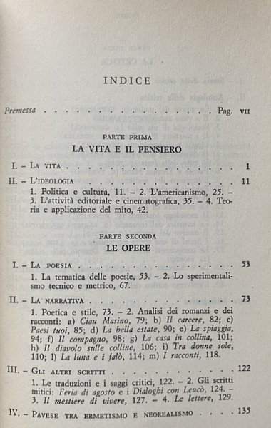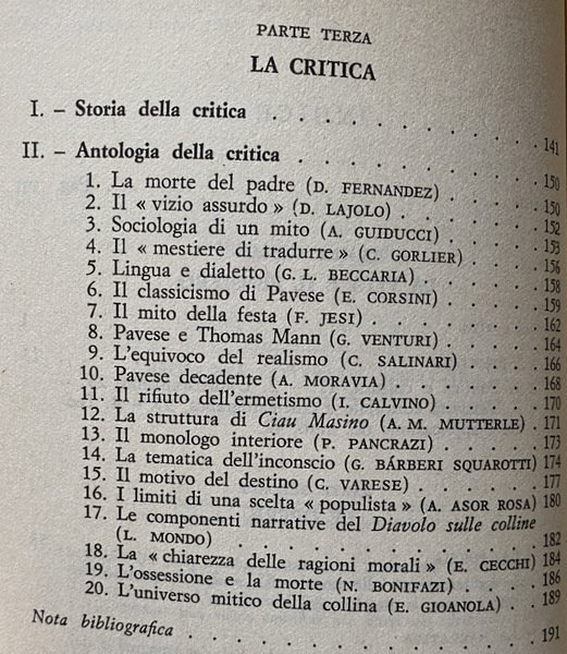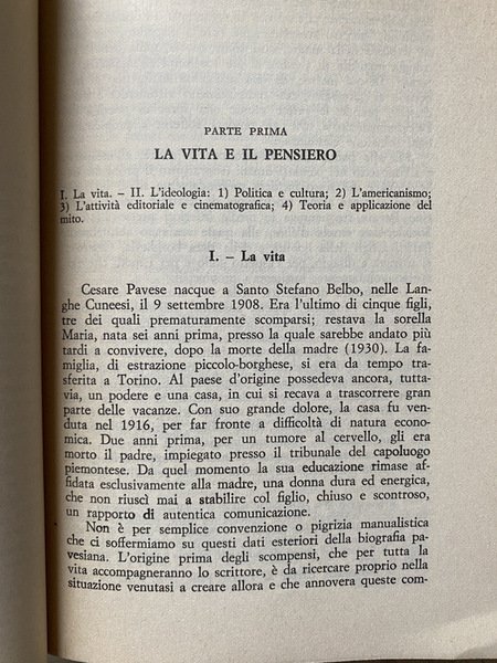 Proprio per questo motivo, pur non trascurando di sottolineare precisi debiti dell'opera pavesiana con la problematica culturale e politica del ventennio 1930-1950, si è insistito sull'interpretazione dei testi, sui loro contenuti mitico esistenziali e, infine, sui procedimenti formali ed espressivi. Solo in questo modo, forse, Pavese può superare una congiuntura storica e critica che ha già preso le sue distanze dagli anni in cui lo scrittore visse e operò.