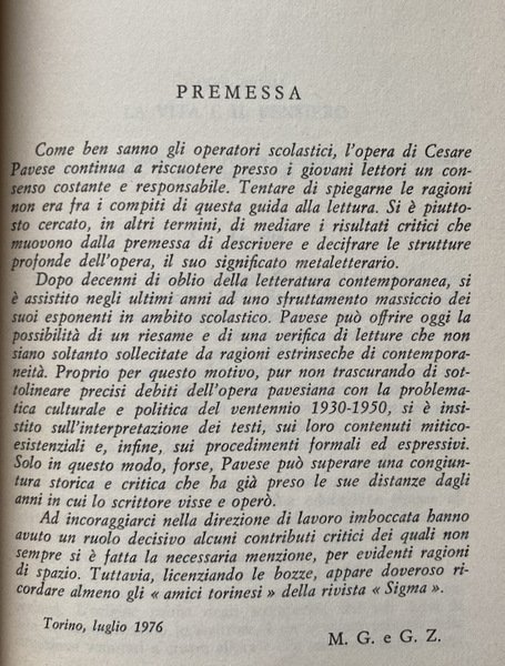 Come ben sanno gli operatori scolastici, l'opera di Cesare Pavese continua a riscuotere presso i giovani lettori un con senso costante e responsabile. Tentare di spiegarne le ragioni non era fra i compiti di questa guida alla lettura. Si è piuttosto cercato, in altri termini, di mediare i risultati critici che muovono dalla premessa di descrivere e decifrare le strutture profonde dell'opera, il suo significato metaletterario.