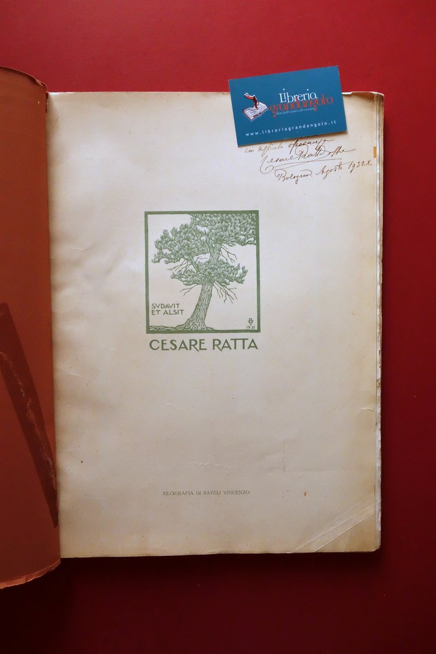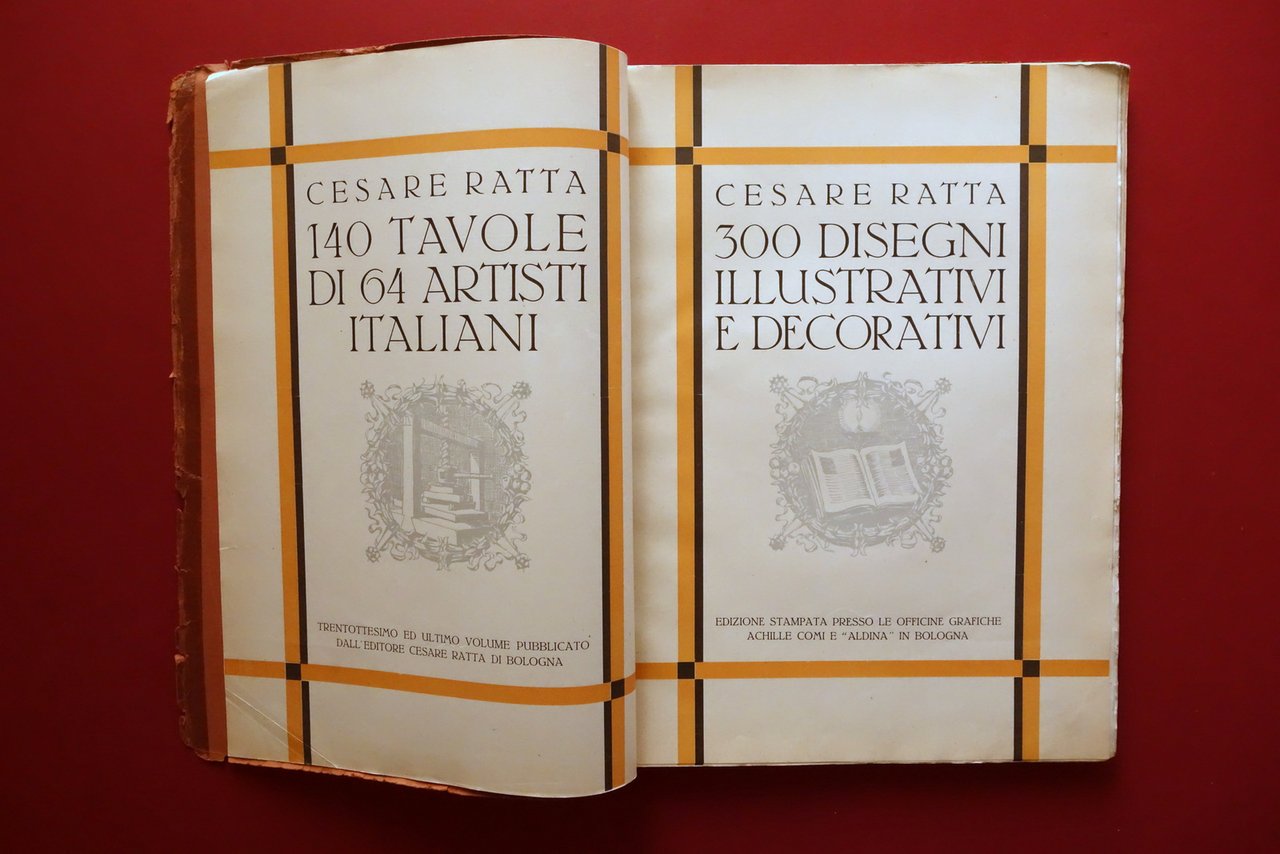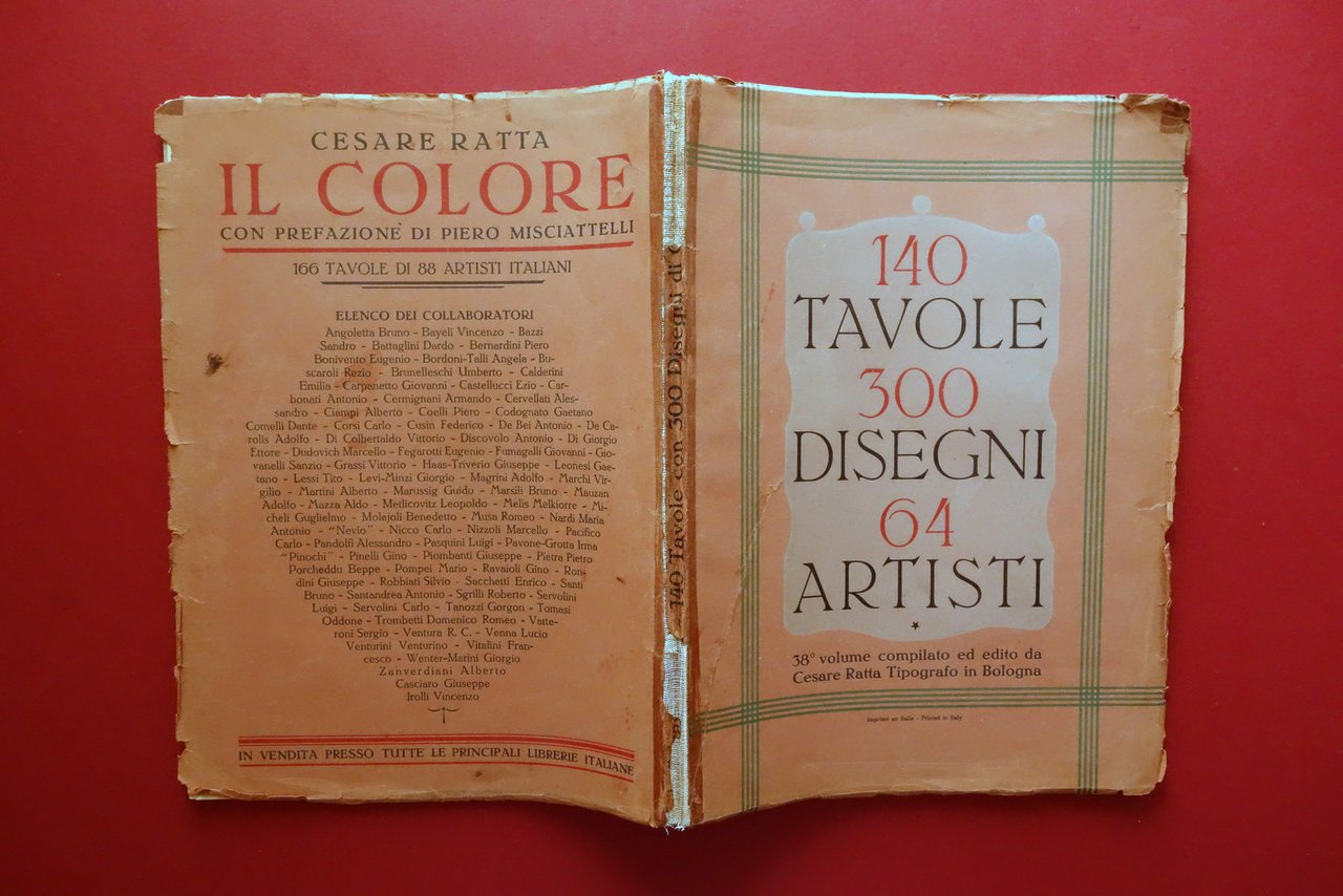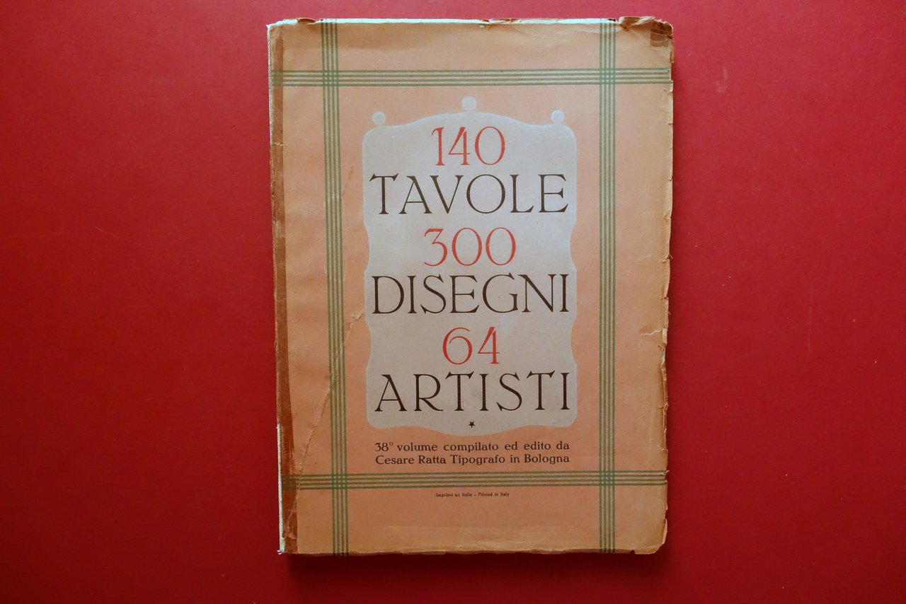Cesare Ratta, † 140 Tavole 300 Disegni di 64 artisti italiani - 38∞ volume compilato ed edito da Cesare Ratta Tipografo in Bologna Officine Grafiche Achille Comi e Aldina, Bologna, s. d. ma 1931; cm 36,5x27; pp. 142 con numerosissime belle ill. in b/n e a colori fuori t., varie delle quali sono applicate (vedi foto). Cartoncino ed. Alla prima pagina dedica autografa firmata del Ratta. † Condizioni di conservazione Complessivamente in buono stato con tracce d'uso; cartoncino ed. sgualcito con alcune piccole marginali mancanze e strappetti, al piatto ant. strappetto di alcuni cm oggetto di restauro mediante nastro per riparazioni cartacee; dorso parzialmente mancante ma rinforzato mediante applicazione di supporto, esemplare compatto. Interni buoni; margine destro di poche pagine con minimi difetti. † Alla prima pagina dedica autografa dell'autore. Edizione numerata; n/s 111. † † SETT107.L26345 N