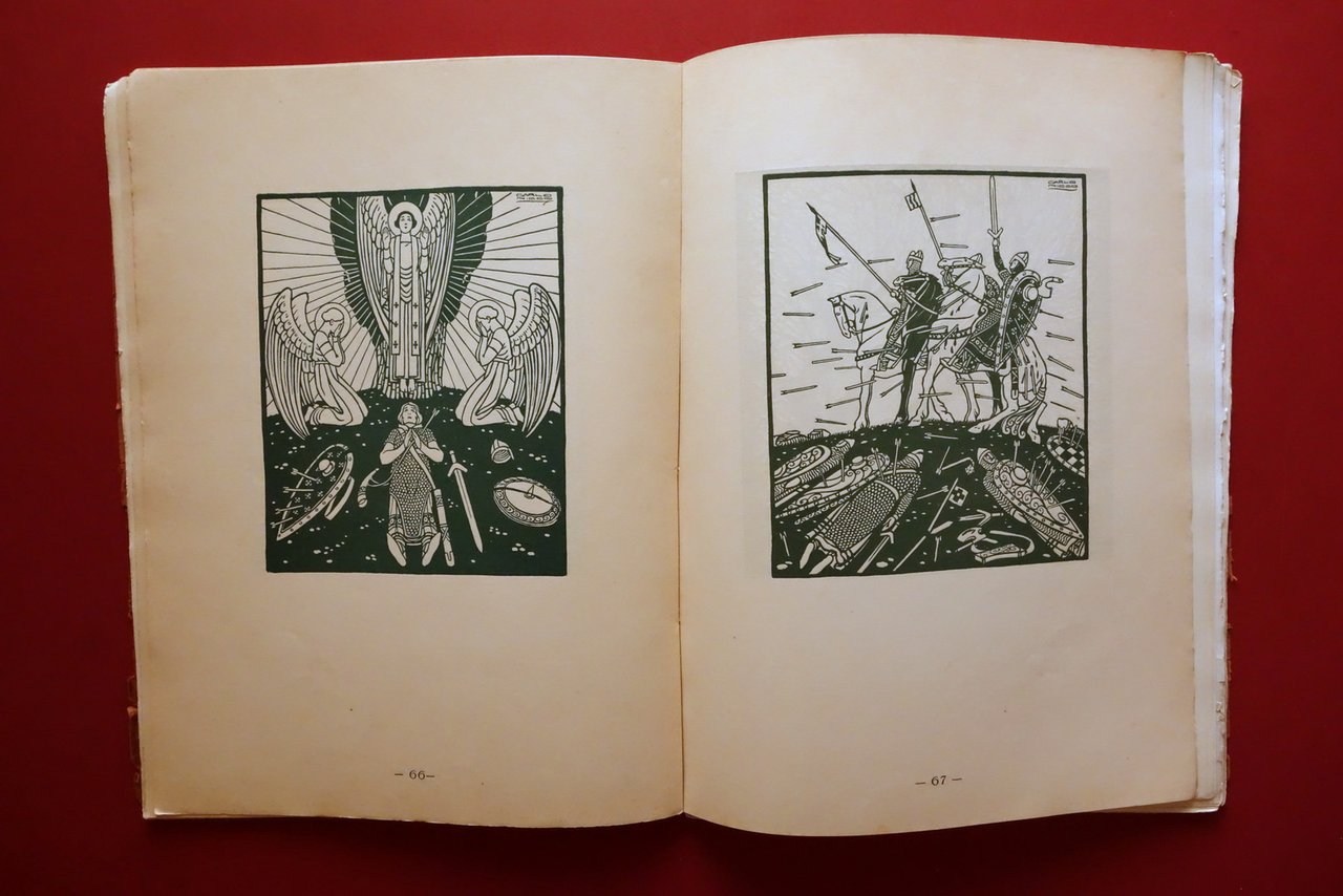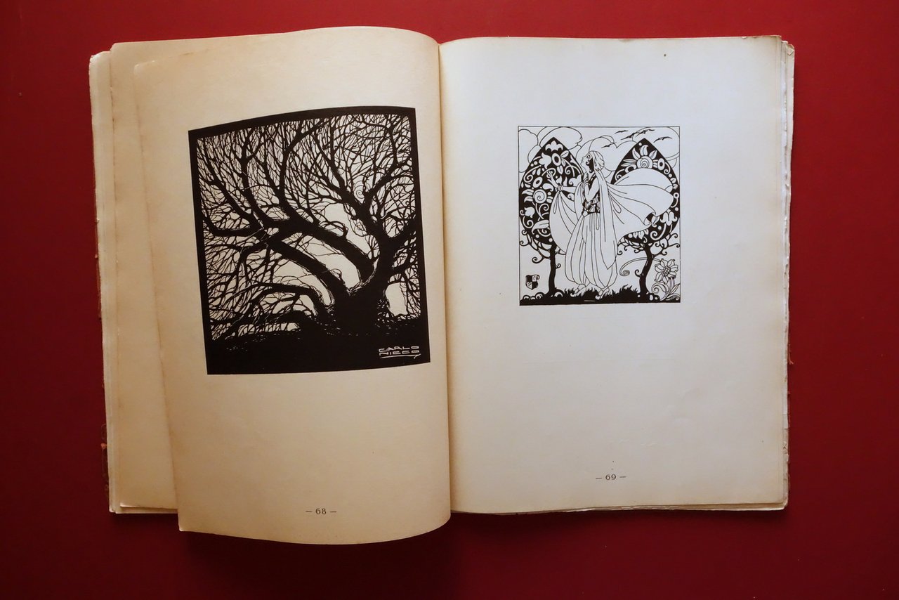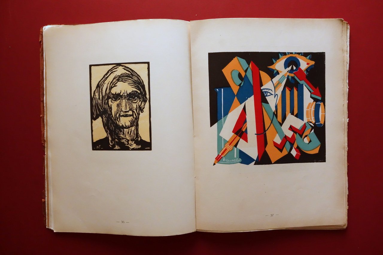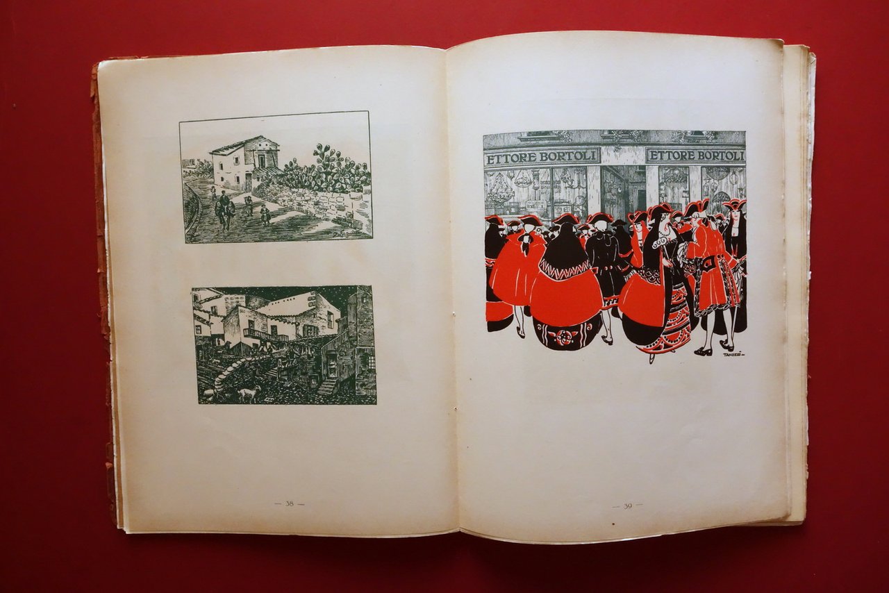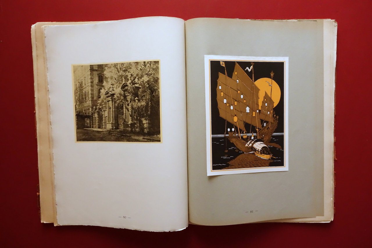 Cesare Ratta, † 140 Tavole 300 Disegni di 64 artisti italiani - 38∞ volume compilato ed edito da Cesare Ratta Tipografo in Bologna Officine Grafiche Achille Comi e Aldina, Bologna, s. d. ma 1931; cm 36,5x27; pp. 142 con numerosissime belle ill. in b/n e a colori fuori t., varie delle quali sono applicate (vedi foto). Cartoncino ed. Alla prima pagina dedica autografa firmata del Ratta. † Condizioni di conservazione Complessivamente in buono stato con tracce d'uso; cartoncino ed. sgualcito con alcune piccole marginali mancanze e strappetti, al piatto ant. strappetto di alcuni cm oggetto di restauro mediante nastro per riparazioni cartacee; dorso parzialmente mancante ma rinforzato mediante applicazione di supporto, esemplare compatto. Interni buoni; margine destro di poche pagine con minimi difetti. † Alla prima pagina dedica autografa dell'autore. Edizione numerata; n/s 111. † † SETT107.L26345 N