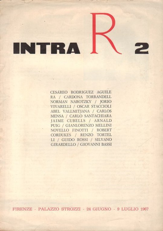 In-folio (cm 34,5 x 25), due bifolii sciolti per pp. non numerate (8); con riproduzioni fotografiche di opere degli artisti coinvolti, un testo teorico in spagnolo e inglese di Cesàreo Rodriguez-Aguilera, una presentazione in italiano, e poesie di J.A. Goytisolo, R. Cordukes, José Corredor Matheos (i poeti spagnoli, pur non facendo parte del Gruppo, aderirono al Movimento - come del resto Fellini, cui la pubblicazione è dedicata). Il nuovo movimento artistico internazionale dell'Intrarealismo si prefiggeva di rappresentare la realtà al di là della propria apparenza, oltre la falsa verità proposta dai mezzi di comunicazione. La prima mostra intrarealista fu proprio questa del 1967 a Palazzo Strozzi. Marginali tracce del tempo, ma buon esemplare.