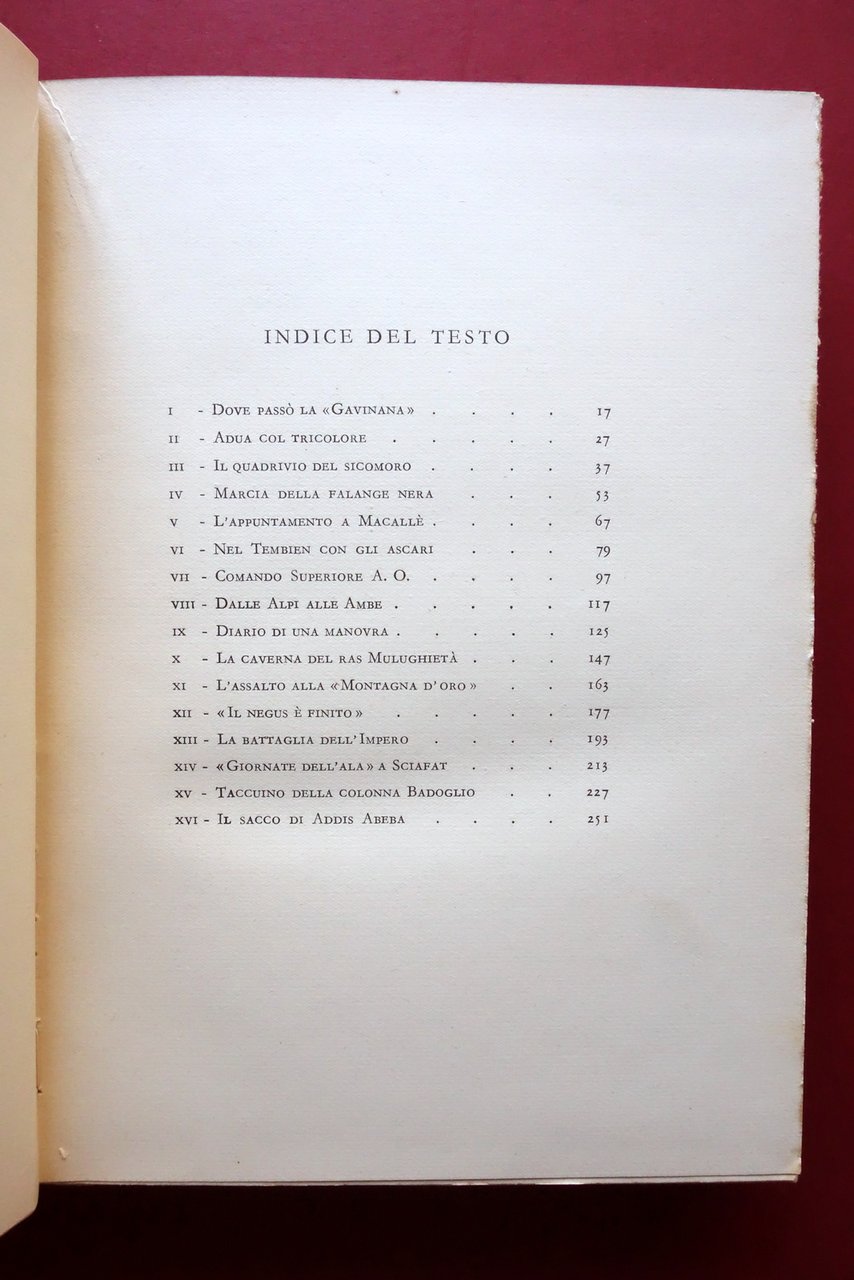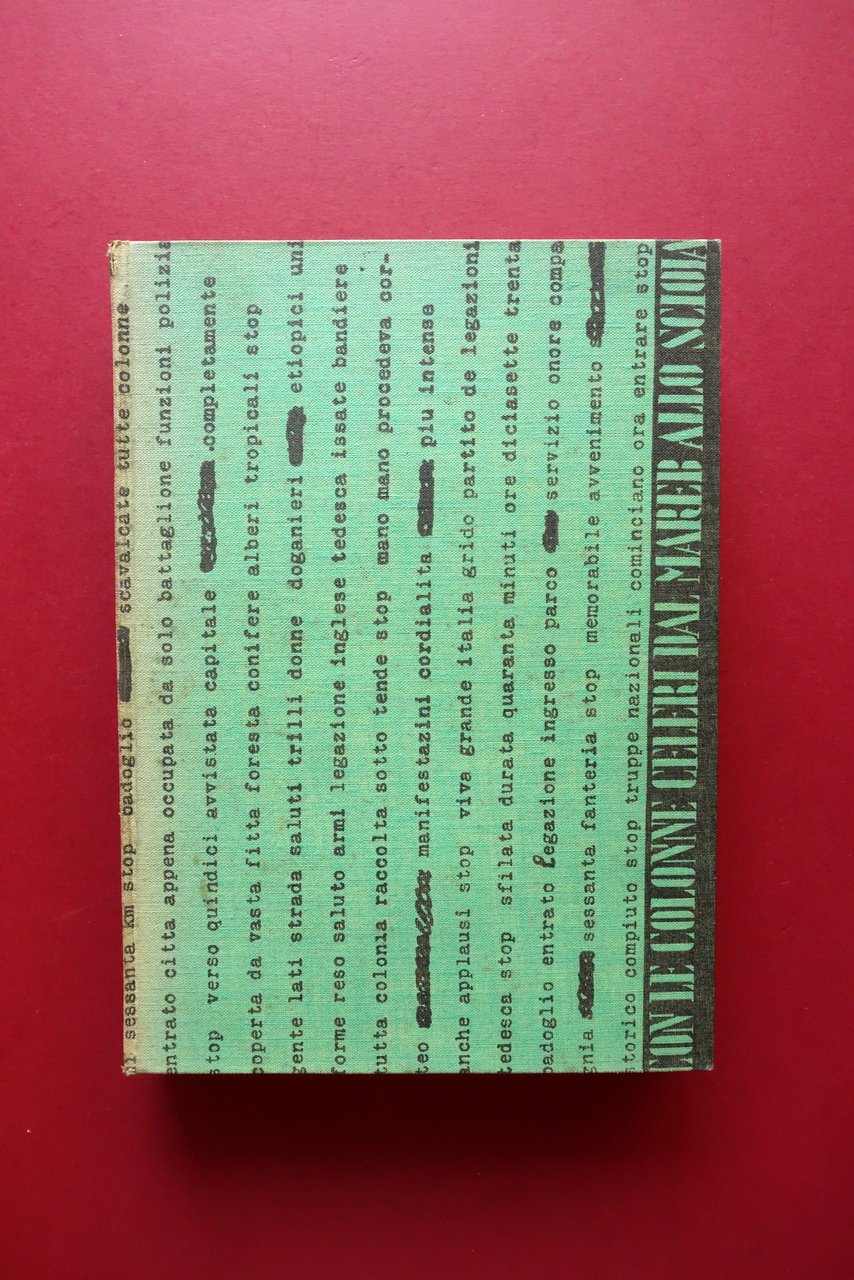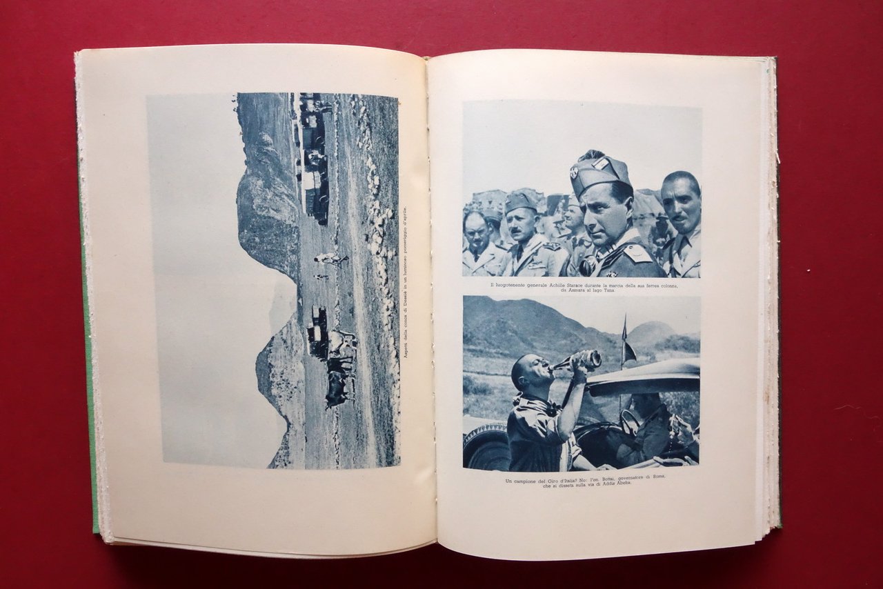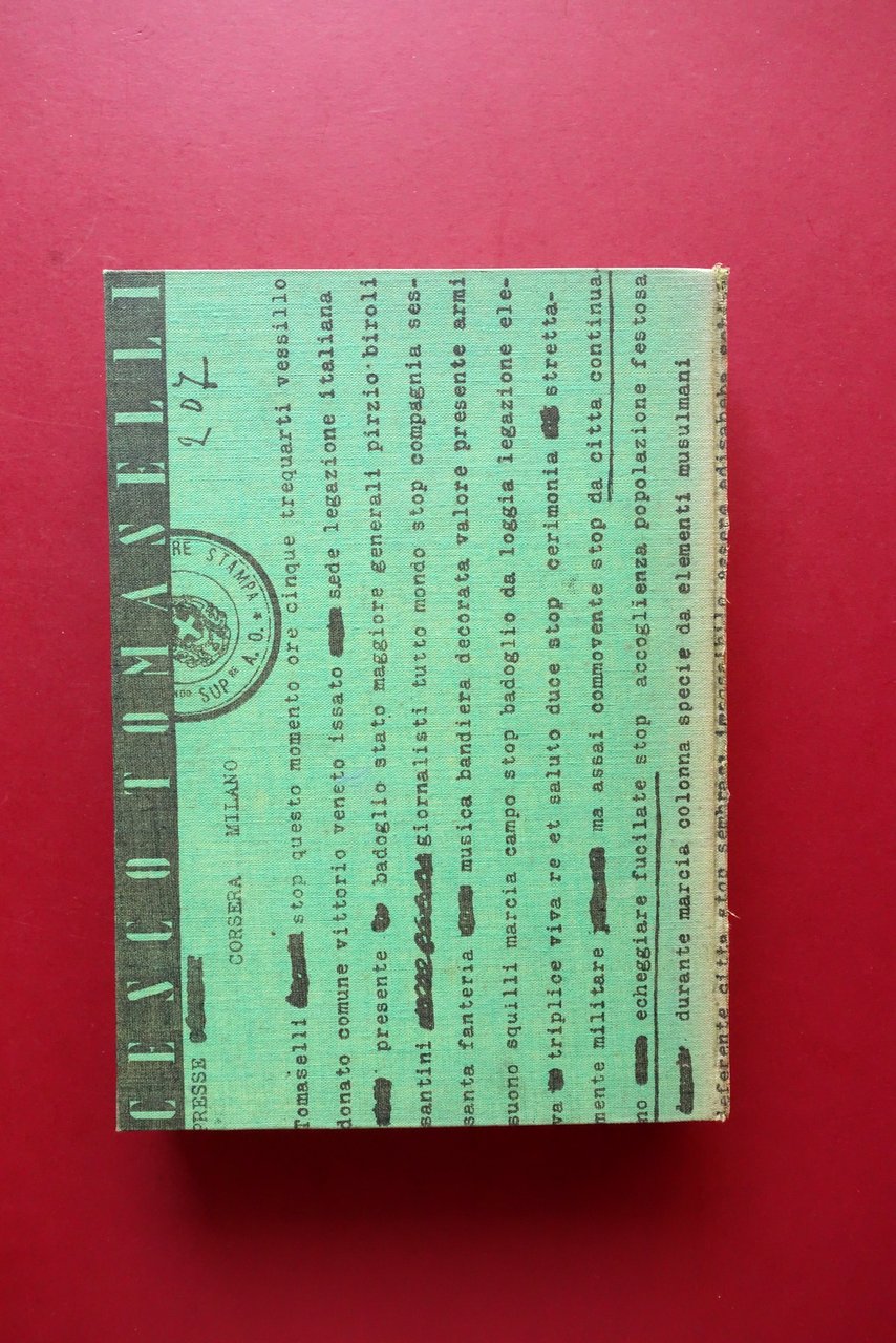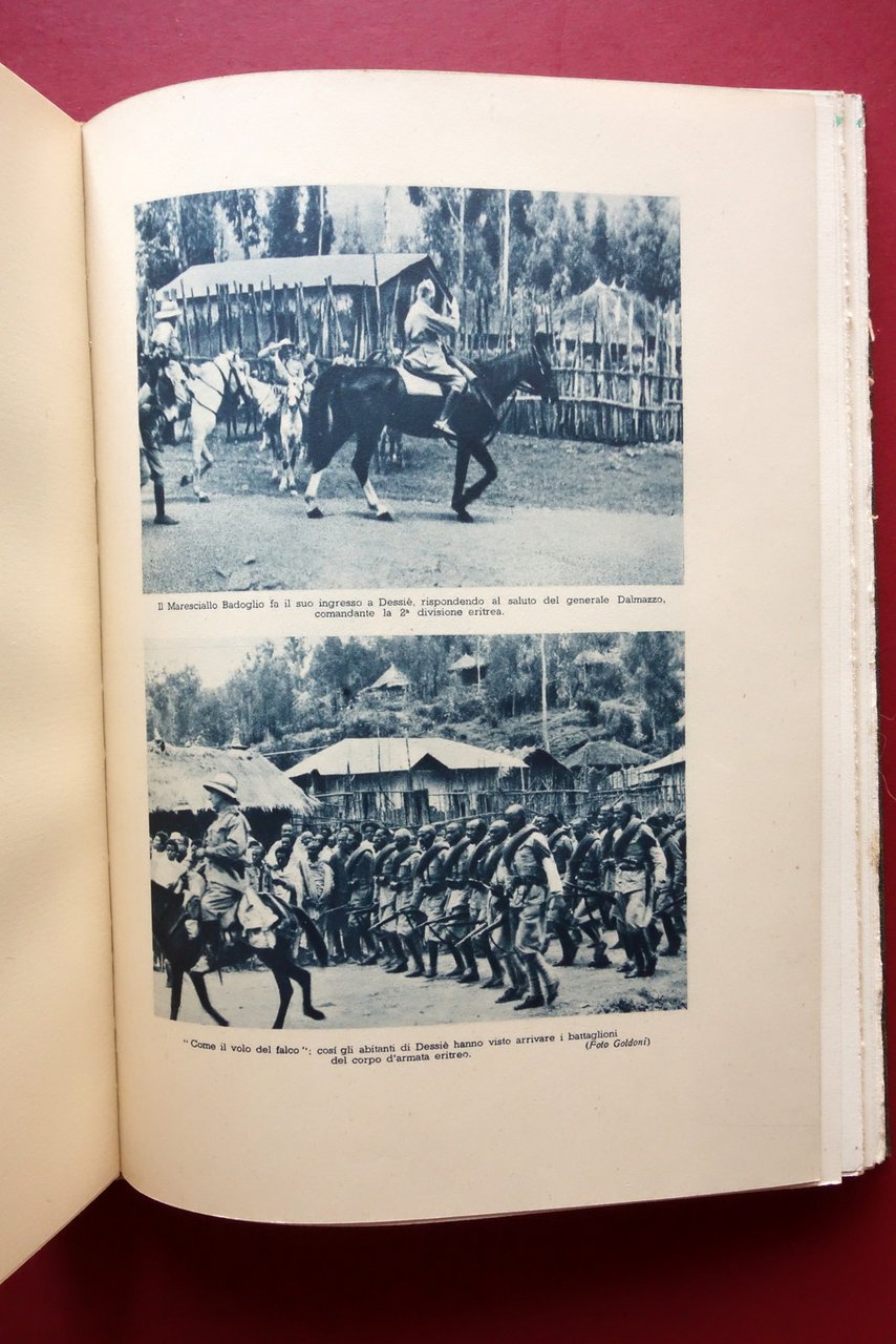 Cesco Tomaselli, Con le colonne celeri dal Mareb allo Scioa con 58 illustrazioni e 5 documenti e schizzi fuori testo Mondadori, Milano 1936; cm 25,5x18; pp. 272 con 58 tavv. fotografiche virate al blu e 5 documenti-tavole ripiegati pi√π volte; legatura ed. in tutta tela con parziale riproduzione di telegramma inviato da Badoglio. Prima edizione (dicembre 1936). Condizioni di conservazione Buone condizioni con tracce d'uso; coperta con minime bruniture; dorso ingiallito con pochi strappetti alla cerniera posteriore, esemplare compatto. Interni buoni con alcune minime bruniture ai tagli. Prima edizione (dicembre 1936). Esemplare che presenta la non comune legatura editoriale in tutta tela rigida. SETT223.L24116 N
