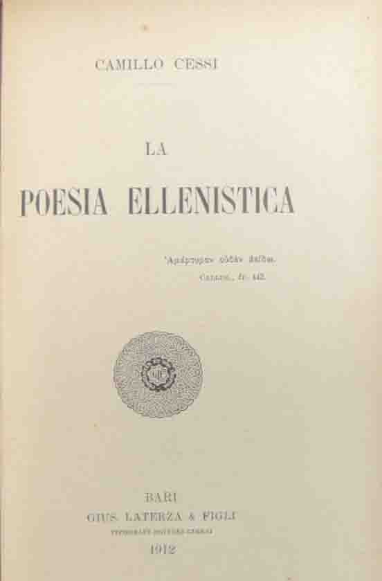 Camillo Cessi, La poesia ellenistica, Gius. Laterza e Figli, Bari 1912, pp. X, 486, cm 20, legatura in mezza tela con titoli in oro al dorso. Firma d’appartenenza e data alla prima pagina, firma d’appartenenza alla prima pagina dell’indice, leggere tracce d’uso alla legatura, sporadiche e leggere sottolineature a biro e pastello e annotazioni manoscritte a lapis ai margini, per il resto ben conservato.