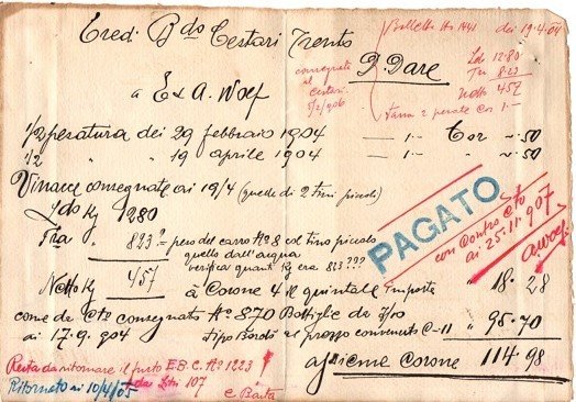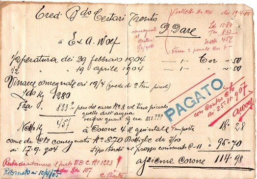Foglio di formato 22x15 cm. Condizioni : USATO - Stato : Buono. Altre note : Fattura scritta a mano nel 1904 ed indirizzata ai fratelli Wolf.