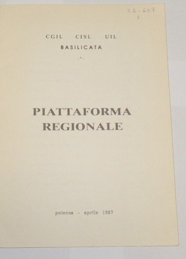 Cgil Cisl Uil Basilicata, Piattaforma regionale. Potenza, aprile 1987, s.n., s.l. s.d. (1987?), pp. 18, cm 22. Lievi tracce d'uso, ma buono.