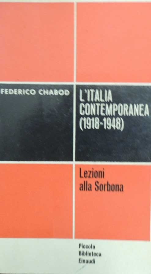 Federico Chabod, L’Italia contemporanea (1918-1948), Giulio Einaudi Editore, Torino 1961, pp. 212, cm 18, br. ed. Collana Piccola Biblioteca Einaudi, n. 11. Sottotilo alla prima di copertina: Lezioni alla Sorbona. Fioriture, leggera brunitura della carta, per il resto ben conservato.