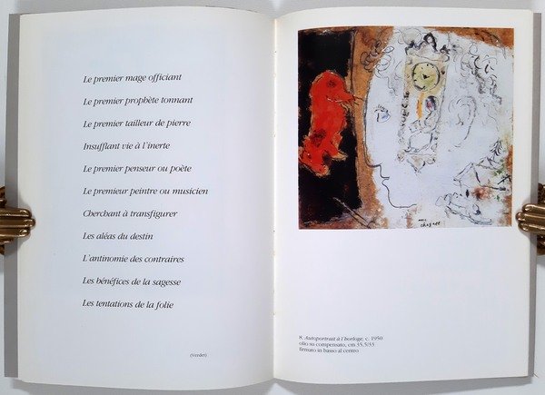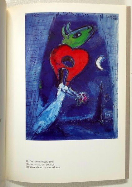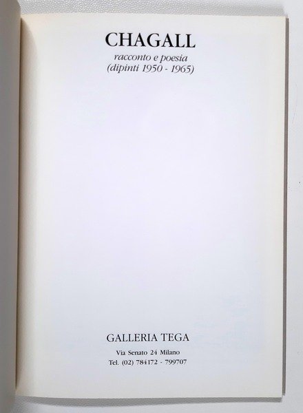 Un volume, 24 x 17 cm, pp. [22 c.]; numerose ill.ni a colori e in b/n nel testo; leg. editoriale in cartonato bianco lucido con titolo al piatto ant. a caratteri neri, sovracoperta di cartone opaco colore grigio, con illustrazione al piatto ant. del maestro Marc Chagall (1887-1985), titolo a caratteri seppia al piatto ant., risvolti grigi; catalogo della mostra tenuta alla Galleria Tega a Milano, ottobre-novembre 1988, composto da occhietto, frontespizio a caratteri neri, testi critici a cura di Dino Tega, 12 copie a colori di opere del maestro con in contropagina poesie di Andrè Verdet dedicate alle opere di Chagall (in francese), biografia; l’anno di pubblicazione non è indicato, ma dovrebbe essere circa il 1990; opera completa (non trovata sul mercato). Rif.: IT\ICCU\LO1\0908440. Cond.: opera quasi in ottime condizioni generali.