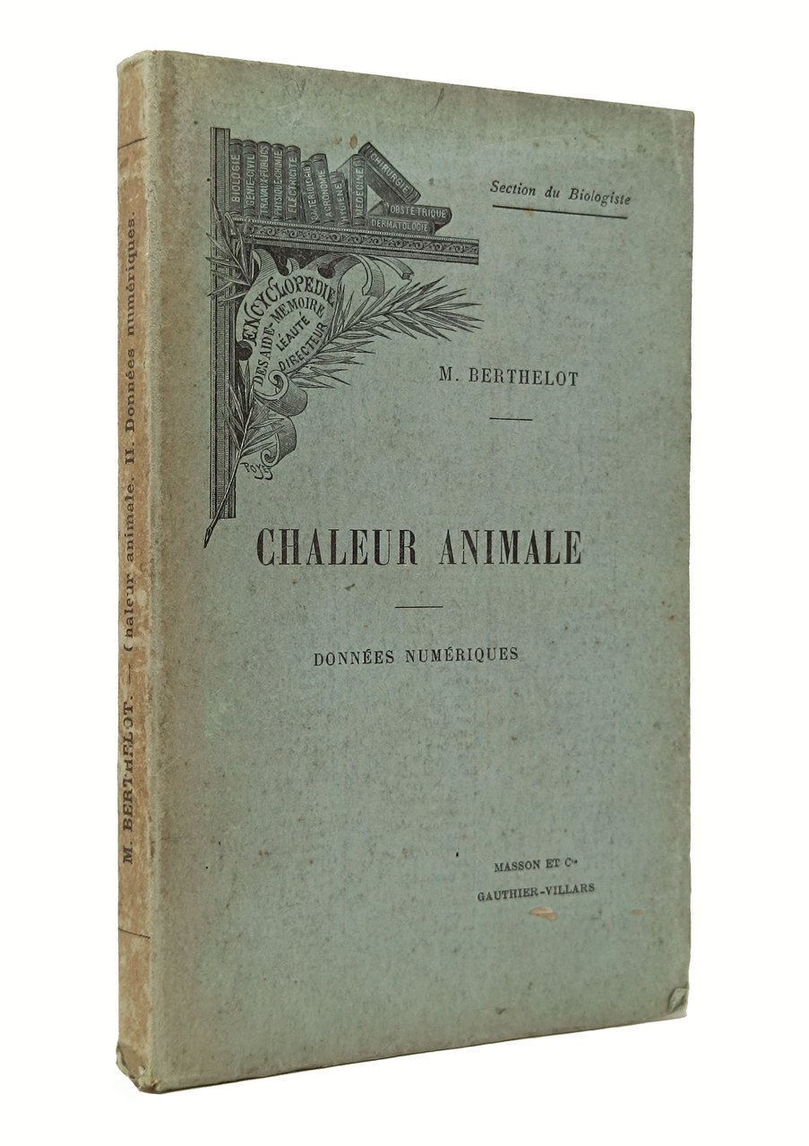 Encyclopedie scientifique des Aide-Mémoire publiée sous la direction de M. Léauté, membre de l'Institut. Section Biologiste. Secondo volume ('Données numeriques') di una delle principali opere del celebre chimico francese Marcellin Berthelot che, tra le altre importanti ricerche e scoperte, applicò i criteri termodinamici agli esseri viventi arrivando così a scoprire che la produzione del calore deriva dalle sostanze alimentari. Edizione originale (non è presente la data su questo secondo volume) del 1899. Editore: Masson et Cie : Gauthier-Villars, Paris. Lingua del testo: francese. Formato: 12 x 19,5 cm circa. Pagine: 148 + [4] + 16 (di catalogo 'Masson et Cie, libraires de l'Académie de Médecine') + [16] di catalogo della librairie Gauthier-Villars. Con numerose tabelle nel testo. Stato di conservazione: esemplare decisamente buono. Interno ancora intonso. Brossura editoriale con copertina flessibile in carta azzurra. Edizione originale di assai difficile reperimento.