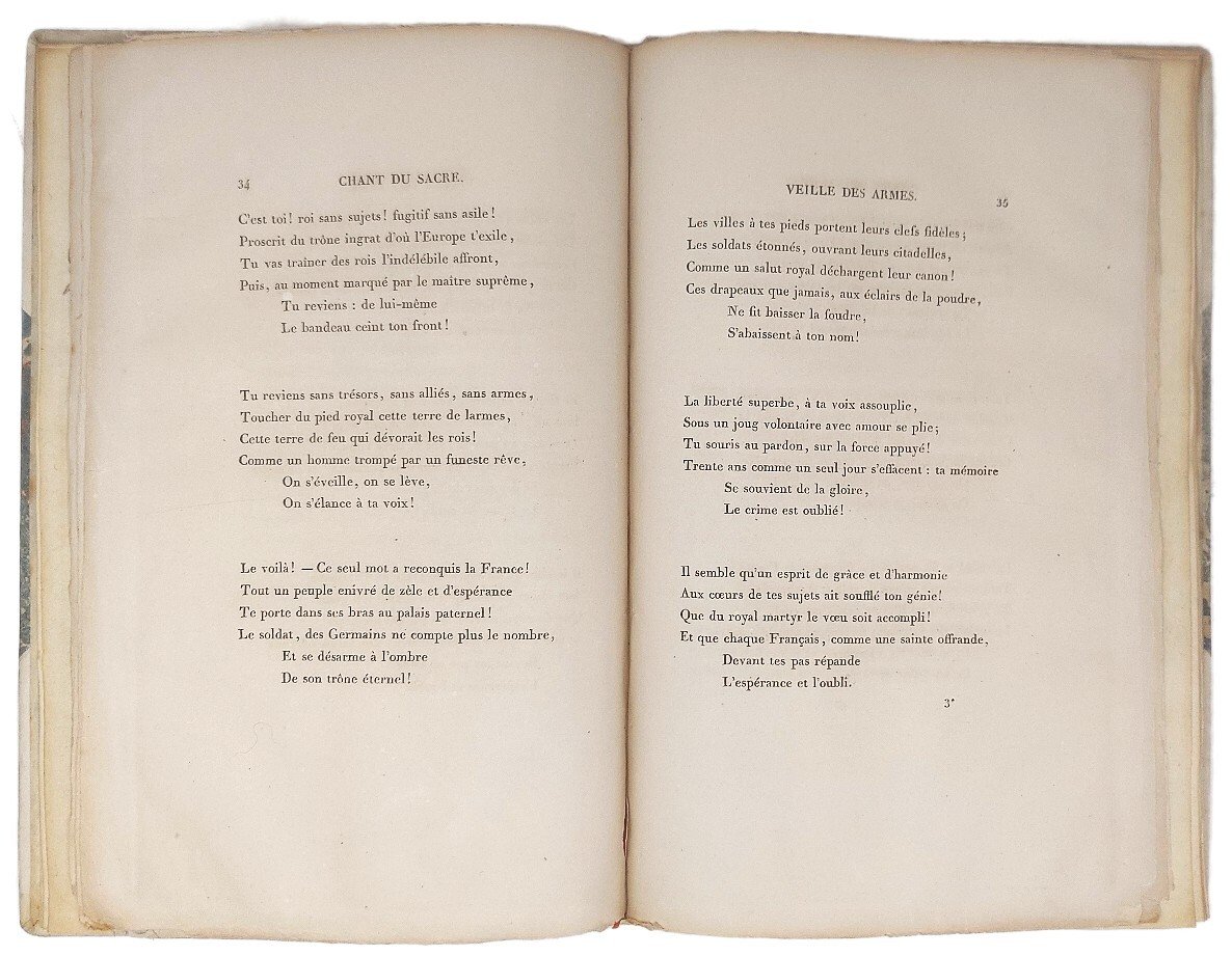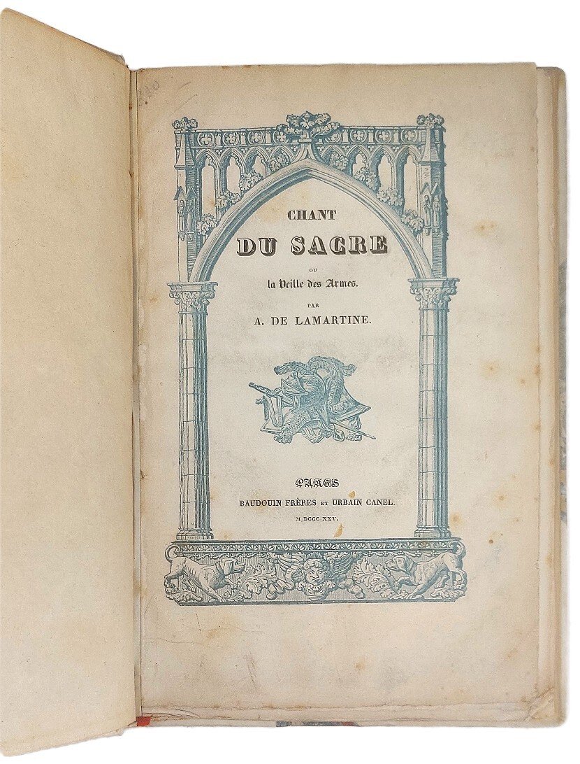>in-8, pp. 64, bella legatura in m. pergamena ed angoli con filett. dorate. Ex libris della biblioteca Remsen Whitehouse impresso in oro al piatto anteriore, titolo su tassello granata e fregi in oro al dorso, altro ex libris in carta applicato all'interno del contropiatto anteriore. Pagina di titolo entro bordura architettonica azzurra. Edizione originale di questo poema che, contenendo alcuni versi offensivi nei confronti del Duca d'Orléans e di suo padre, causò non pochi fastidi al poeta. Tali versi, depennati nalla seconda tiratura, appaiono nuovamente in questa terza tiratura in testa alla p.20. Raro. In tre fogli preliminari sono presenti tre pagine manoscritte ottocentesche di commenti assai interessanti sul testo di Lamartine Buon esemplare, fresco, a pieni margini (lievi fioriture della carta). Victaire, IV. 960-3. Carteret, II, 20-21.
