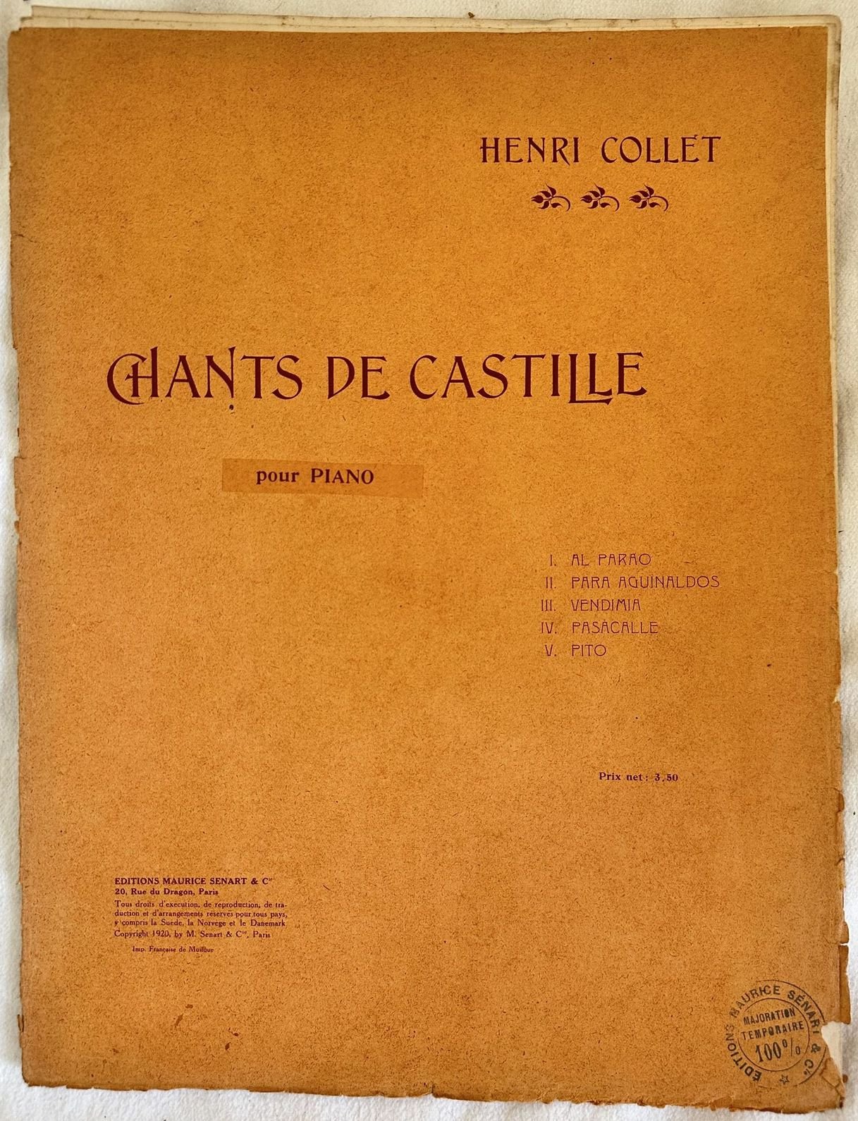 Edizione del 1920 di questo spartito per pianoforte della melodia "Chants de Castille" di Henri Collet compositore e pianista francese. In buone condizioni. Copertina editoriale in discrete condizioni con usure marginali. Legatura editorialmente assente. Pagine in buone condizioni con rare fioriture. In folio. cm. 35x27. Pp. 9.Edition of 1920 of this score "Chants de Castille" by Henri Collet french composer and piano player. In good conditions. Editorial cover in fair conditions lightly worn in the extremities. Binding is editoriarly missing. Pages in good conditions with occasional foxing.In folio. cm. 35x27. Pp. 9.