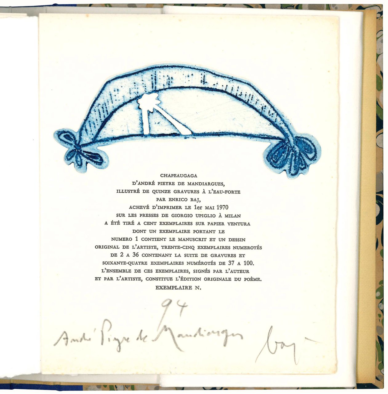 Mm. 179x148. Pp. 31, [9]. Con 15 acqueforti originali a colori di Enrico Baj, di cui due a piena pagina con inserti a collage. Legatura in mezza tela editoriale con titolo inciso in oro al dorso e piatti marmorizzati, contenente brossura bianca muta in 10 bifoli sciolti. Custodia rigida in cartonato marmorizzato. Stampato il 1° maggio 1970 sui torchi di Giorgio Upiglio a Milano, in cento esemplari su carta Ventura, di cui un esemplare, numerato col numero 1, contiene il manoscritto e un disegno originale dell'artista, 35 esemplari, numerati da 2 a 36, contengono la suite di acqueforti, e 64 esemplari sono numerati da 37 a 100. Tutte queste copie, firmate dall'autore e dall'artista, costituiscono l'edizione originale del poema (ns copia n. 94). Cofanetto leggermente consunto al piatto anteriore, per il resto copia ottima.