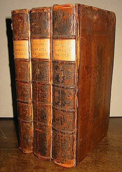 8vo (cm. 19,8), 3 Voll., 1 c. bianca, 1 antiporta figurata, 2 frontespizi figurati, IV-364 pp.; 1 c. bianca, 443(1) pp.; 1 c. bianca, 2 cc.nn., 391(1) pp., 28 cc.nn. Testatine incise. Legature coeve (usurate) in piena pelle con nervi e titolo oro su tassello in pelle chiara al ds. Piatti con fregi a secco a motivi floreali. Cerniere allentate e mancanze alle cuffie. Quest’opera è considerata il primo trattato inglese di filosofia morale.
