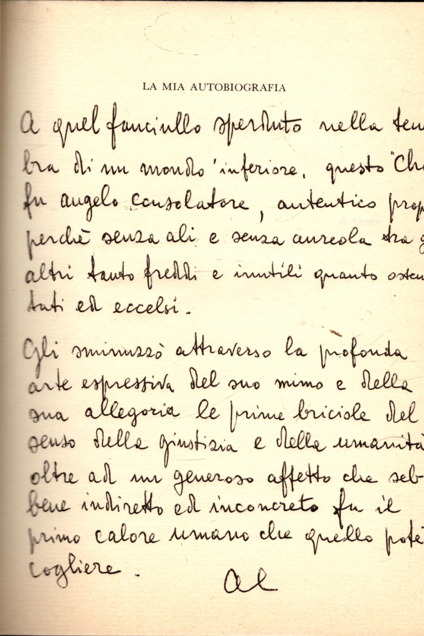 Scritte fra il 1959 e il 1963 queste pagine sono incredibilmente dense e sentite. Fluide e avvincenti come un romanzo, raccontano la storia di un uomo venuto dal nulla che inventò il cinema. Qui ci sono gli indizi per scoprire il segreto di Chaplin e, allo stesso tempo, le storie e i pettegolezzi di un'epoca straordinaria, gli incontri con personaggi come Gandhi, Einstein, Roosevelt, Krusciov, Stravinskij, con le stelle del cinema e le bellezze di Hollywood. Ma è la magia di una narrazione lineare, sobria, mai compiaciuta, a fare di questo testo un'opera anche letteraria.