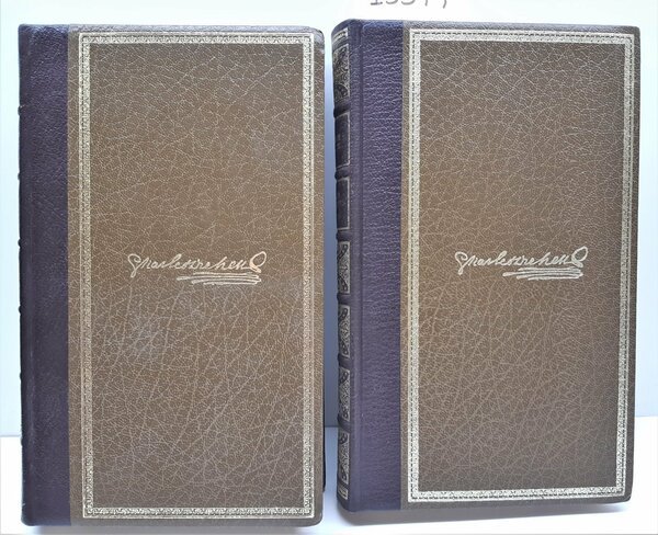 legatura rigida editoriale in pelle marrone con fregi e firma dell'autore in oro al piatto anteriore, dorso a 6 nervi con fregi e titoli leggermente scoloriti, al primo volume lieve ammaccatura al margine superiore del dorso, alla quarta di copertina di entrambi i volumi traccia di etichetta al margine inferiore, angoli dei piatti leggermente deformati, tagli ingialliti con lievissime fioriture e impolverati quelli superiori, interno in buono stato fogli di guardia marmorizzati, numero pagine 300 + 11 + 408, dimensioni di ciascun volume cm 20,8 * 13