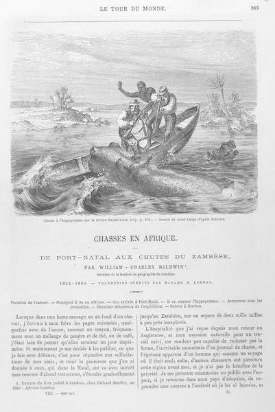 Le tour du monde, s.d. (après 1863). Cahier in/4 extrait de la revue “Le tour du Monde”, p. 369 à 416, 1 carte, illustrations in et hors-texte. Extraits du livre publié à Londres, chez Richard Bentley “African Hunting”. Chasse à l’hippopotame, l’éléphant, à la girafe, au rhinocéros, au crocodile, à l’autruche, au lion, harrisbuck (aigocère noir), babouins, aux serpents, aux antilopes coudous.