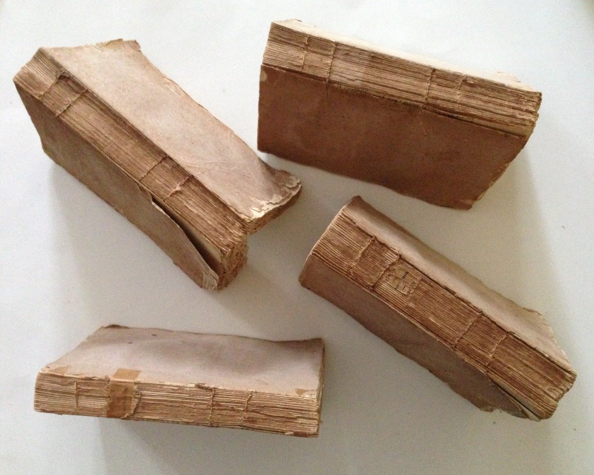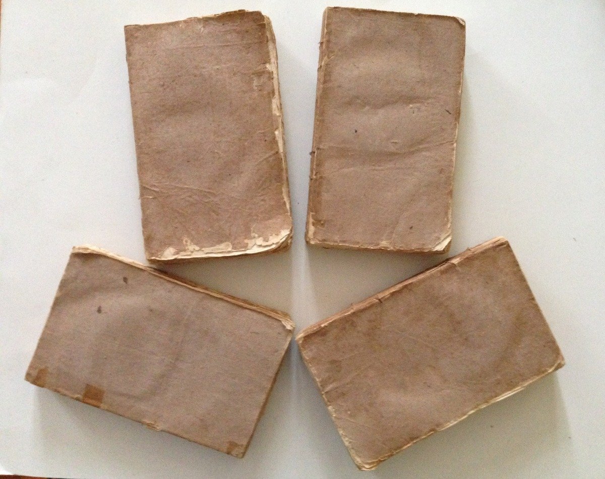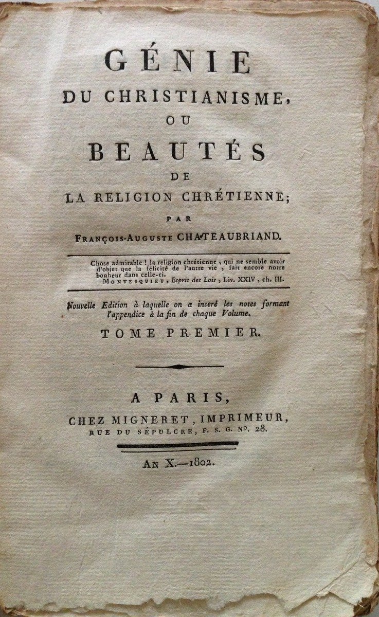CHATEAUBRIAND FRANCOIS-AUGUSTE, LE GENIE DU CHRISTIANISME, OU BEAUTES DE LA RELIGIONE CHRETIENNE - 4 tomi - PARIS, CHEZ MIGNERET 1802, 4 voll. in 8°, pp. VIII-288 (56), 336 (16), 304 (16), 352 (48), legatura di attesa, appendici accluse alla fine di ogni tomo e non formano un tomo a sé (spesso le appendici costituiscono il quinto tomo). Condizioni di conservazione Esemplari in modesto stato con tracce d'uso; legatura di attesa con cucitura allentata, i volumi sono parzialmente sciolti; mancanza parziale dei dorsi e di alcuni margini delle brossure; interni buoni e freschi con piccole minime bruniture, tomo 4 con una gora che coinvolge le prime 10 pagine. MM1429.F3-362