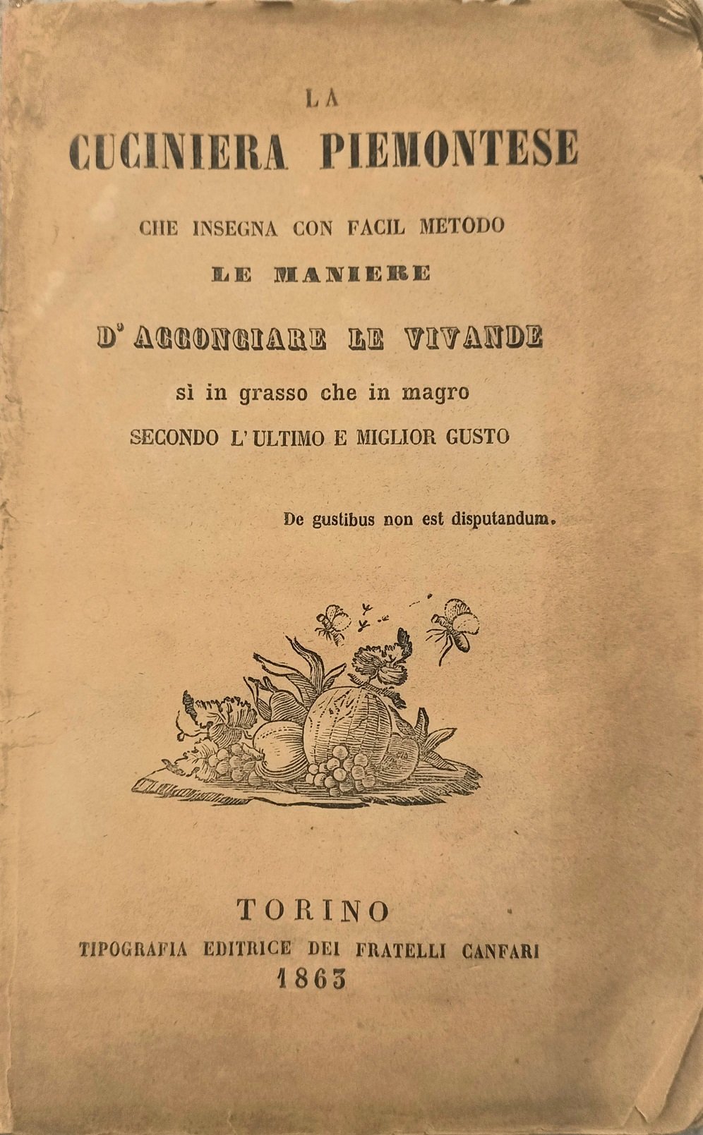 >In-16, pp. 128, brochure editoriale con vignetta xilografica al piatto anteriore con il motto "De gustibus non est disputandum". Famoso ricettario di piatti tipici della tradizione del Piemonte, stampato per la prima volta a Vercelli presso Beltramo Antonio Re nel 1771 e a cui seguirono numerosissime riedizioni aggiornate. Tra i piatti illustrati: il vitello alla Piemontese, semola al latte, zuppa alla Savoiarda, vari intingoli e salse... Segue la spiegazione di certe parole francesi che si usano anche in Italia col modo d'allestire alcune vivande. Angoli dei piatti lievemente consumati e lieve brunitura al piatto superiore ma volume in ottimo stato, cosa piuttosto inusuale per un libro di cucina.