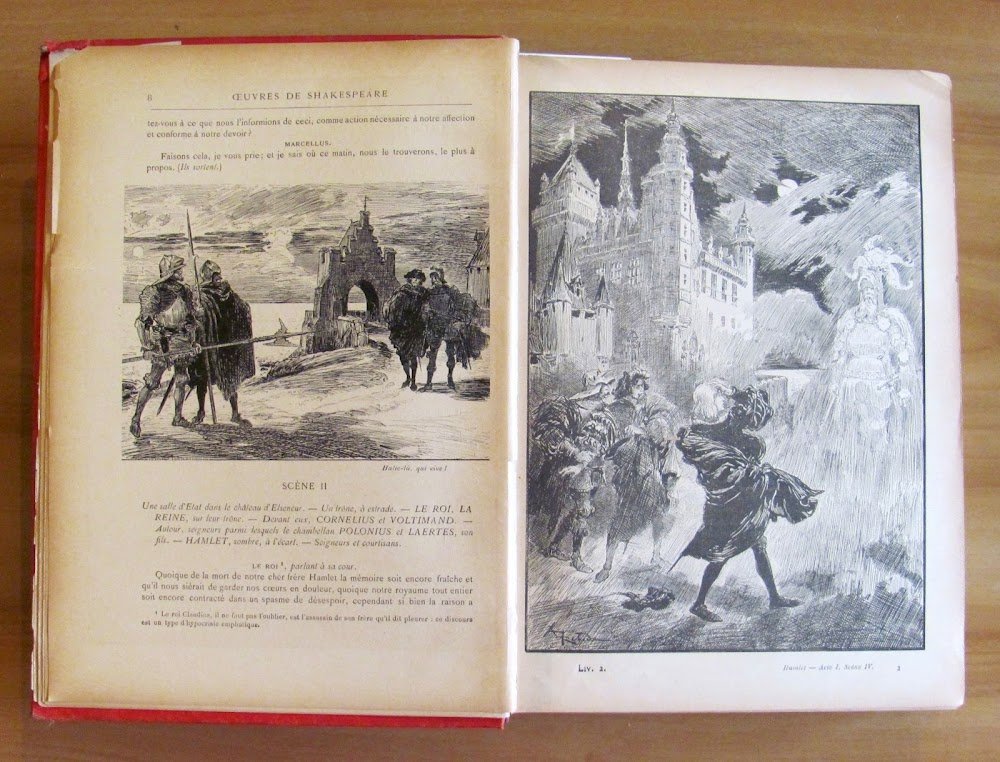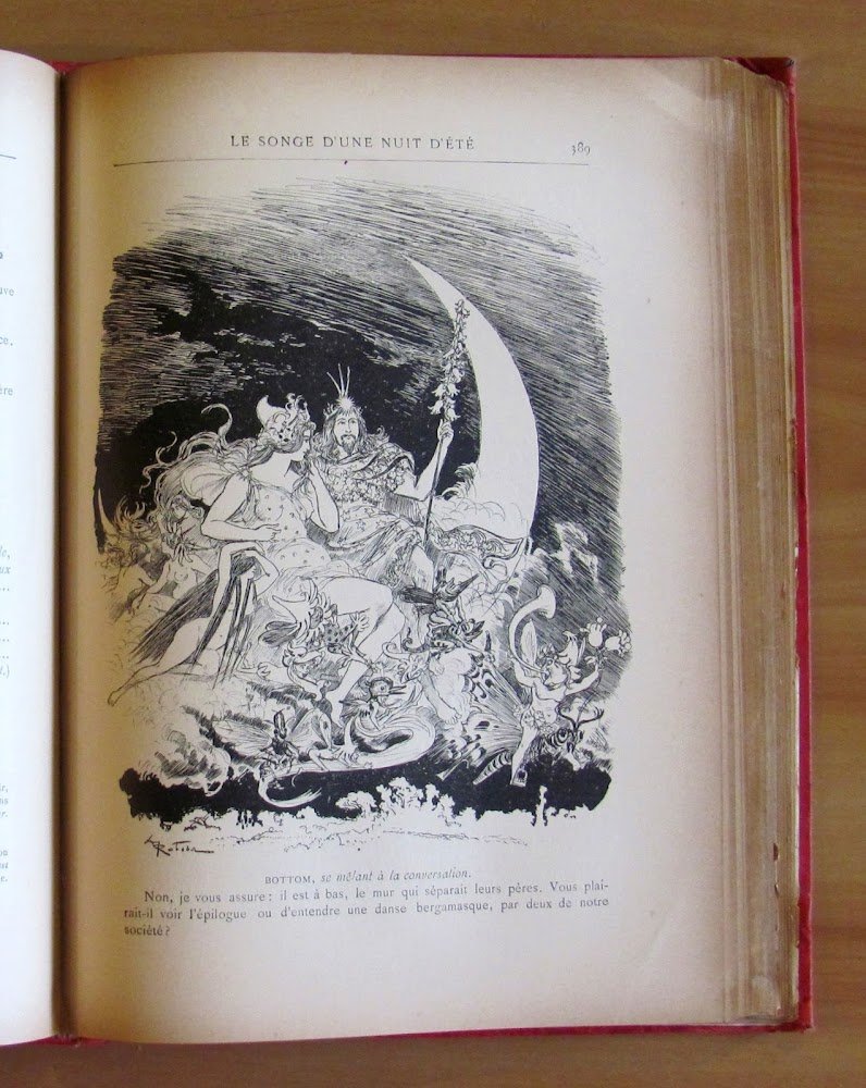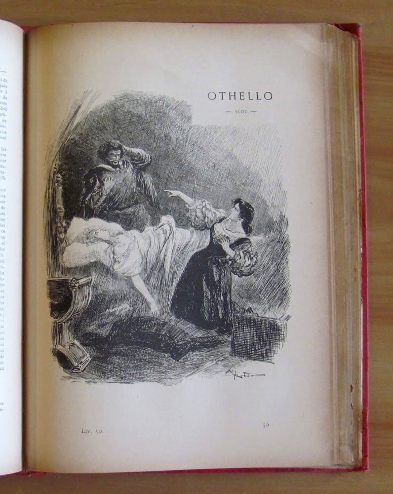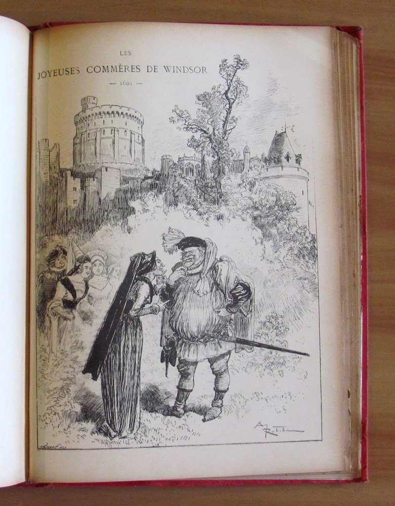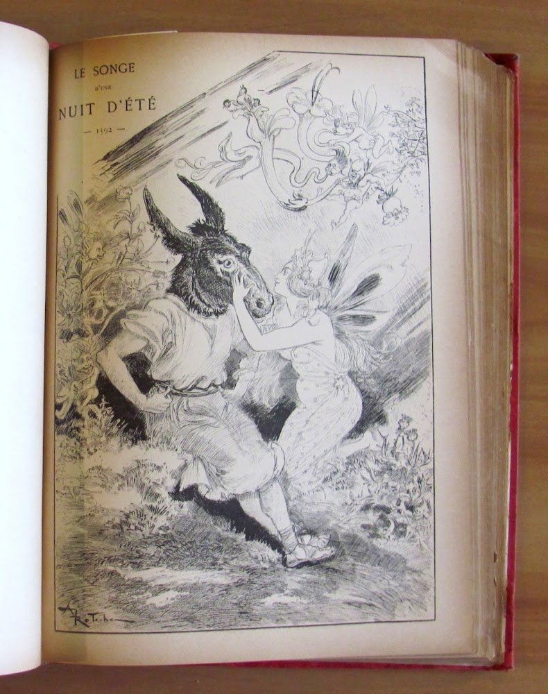 Hamlet - Romeo et Juliette - Macbeth - Le Songe d'une Nuit d'Eté - Othello - Les Joyeuses Commères de Windsor. Moltissime illustrazioni in b/n n.t., di cui molte a piena pagina, di A. Robida. Ed. Edouard Cornély - Paris, 1900. Tela editoriale con titoli in oro al piatto e al dorso e tagli dorati alle pagine. Le copertine presentano tracce del tempo e una leggera imperfezione alla metà superiore della cerniera posteriore. Da pagina 566 a 569 sono presenti traccie di vecchio scotch nell'angolo basso esterno che non lede immagini o testi. Le prime e ultime 4 pagine del libro risultano leggermete vissute, con piccoli taglietti o mancanze che non ne inficiano comunque la bellezza. 22x30; pp.631. Raro e in Buonissimo stato.
