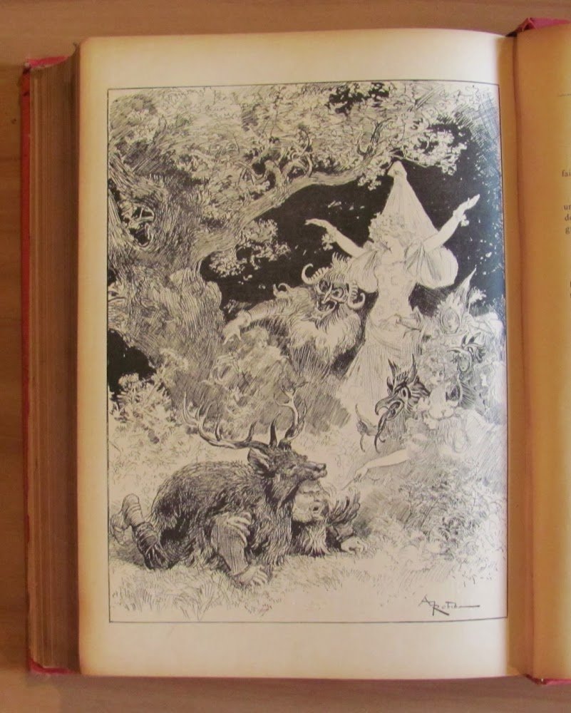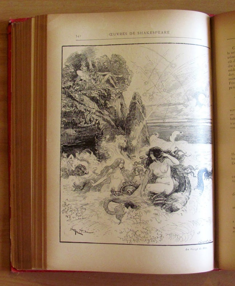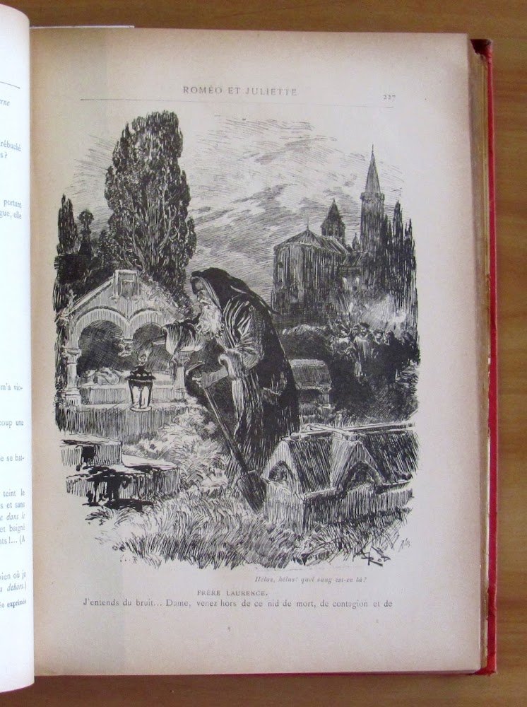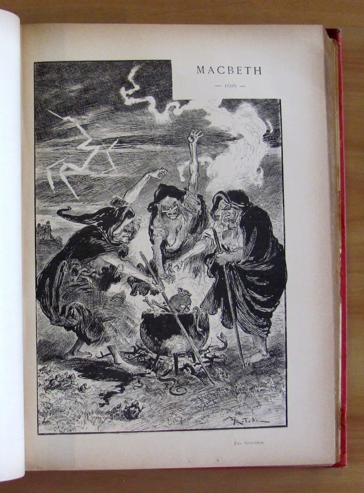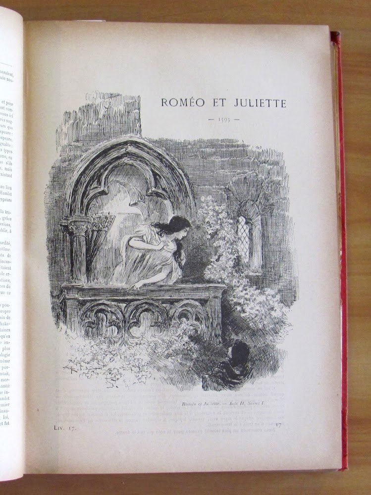 Hamlet - Romeo et Juliette - Macbeth - Le Songe d'une Nuit d'Eté - Othello - Les Joyeuses Commères de Windsor. Moltissime illustrazioni in b/n n.t., di cui molte a piena pagina, di A. Robida. Ed. Edouard Cornély - Paris, 1900. Tela editoriale con titoli in oro al piatto e al dorso e tagli dorati alle pagine. Le copertine presentano tracce del tempo e una leggera imperfezione alla metà superiore della cerniera posteriore. Da pagina 566 a 569 sono presenti traccie di vecchio scotch nell'angolo basso esterno che non lede immagini o testi. Le prime e ultime 4 pagine del libro risultano leggermete vissute, con piccoli taglietti o mancanze che non ne inficiano comunque la bellezza. 22x30; pp.631. Raro e in Buonissimo stato.