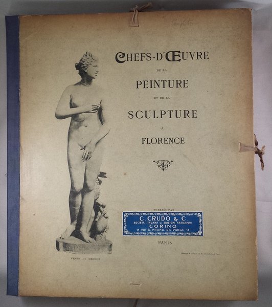 In-4 (30 cm) 1 cartella (2) 119 c. (di tav.). Non rilegate, ma raccolte in una cartella editoriale in mezza tela, chiusa da laccetti telati; riprodotto sul piatto anteriore frontespizio e un tassello "C. Crudo & C. Società Italiana di Edizioni Artistiche Torino 11, via S. Franc. Da Paola, 11". 119 tavole rappresentanti le opere pittoriche e le sculture più rilevanti della città di Firenze. Le cartelle e le tavole sono in ottime condizioni. Lingua francese
