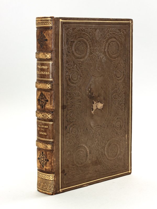 Chefs-d'Oeuvre des Théatres Etrangers, Tome 6, 1 vol. in-8 reliure romantique de l'époque plein veau brun, dos à 5 nerfs plats dorés estampé à froid, belle plaque estampés à froid aux plats, tranches marbrées, Chez Ladvocat, Paris, 1822, 532 pp. Etat très satisfaisant (dos et plats lég. frottés, très bon état par ailleurs, ex-libris Vicomte de Barral).