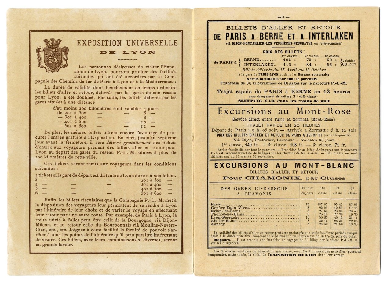 >in-8 (mm 185x125), pp. (12), brossura editoriale figurata a colori. Opuscolo turistico con orari e prezzi dei treni per poter raggiungere Lione in occasione dell'Esposizione Universale del 1894. Al fondo, mappa dell'Esposizione. Ottimo stato.