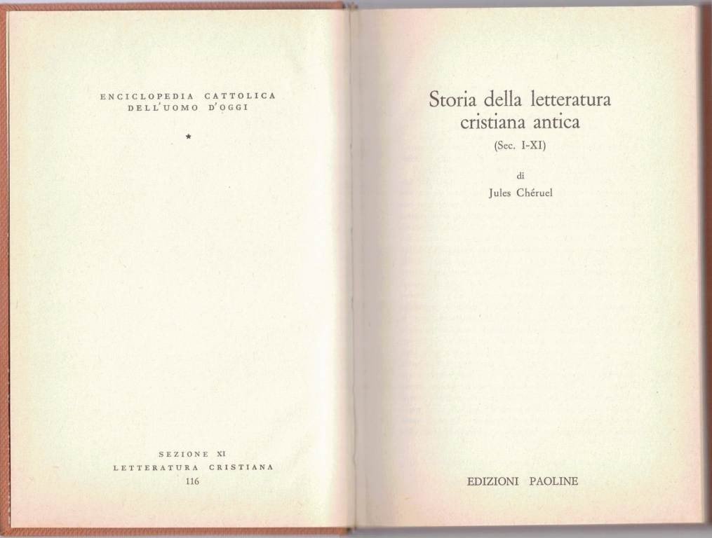 Jules Chéruel, Storia della letteratura cristiana antica. (Sec. I-XI), Edizioni Paoline, Catania 1963, pp. 274, cm 18, cart. ed. con titoli e fregi al dorso e fregi al piatto. Collana Enciclopedia cattolica dell’uomo d’oggi. Sezione XI. Letteratura cristiana, vol. 116. Titolo dell’opera originale: Brève histoire de l’ancienne littérature chrétienne. Traduzione e aggiornamento di L. Rosadoni. Lievissima brunitura della carta, minime fioriture al taglio inferiore, per il resto ottimo.