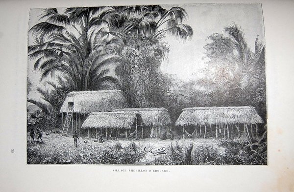 In quarto grande (29,4x20,2 cm); (8), IV, 614, (2) pp. e una grande c. di tav. fuori testo più volte ripiegata. Bellissima legatura coeva in mezza pelle rossa con titolo e ricchi fregi in oro al dorso. Dorso a cinque nervi. Tagli dorati. Un piccolo strappetto senza perdita di carta alla mappa più volte ripiegata. Piccole strofinature ininfluenti e qualche leggerissima fioritura in poche pagine dovuta alla qualità della carta ma nel complesso bellissima copia in bella legatura coeva. Prima edizione di questo celebre racconto di viaggio del celebre esploratore e geografo francese Henri Anatole Coudreau originario di Sonnac. L'autore fu tra i primi ad esplorare la Guyana francese e a risalire il Rio delle Amazzoni. Questo celebre racconto venne terminato dalla moglie dello stesso Codreau che lo seguì nelle sue esplorazioni, morto nei dintorni del lago Tapagem . durante il tentativo di raggiungere le sorgenti del Rio delle Amazzoni. L'opera è illustrata da 98 bellissime incisioni, 18 delle quali a piena pagina. Prima edizione in buone condizioni di conservazione ed in bella e ricca legatura coeva. First edition, a good copy.