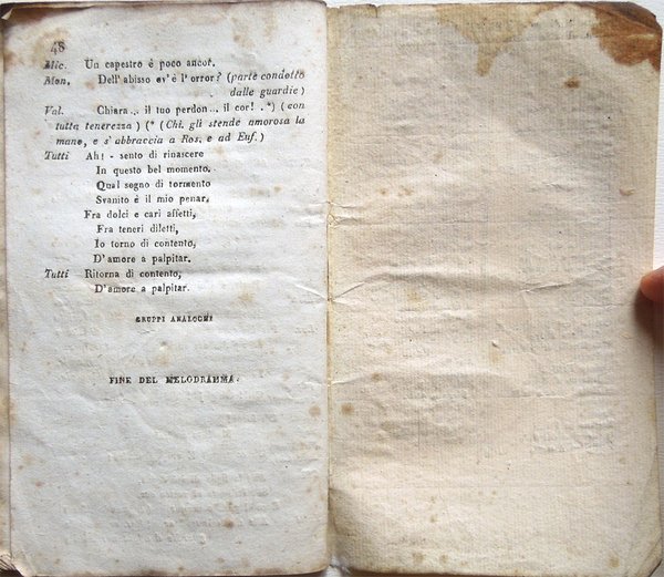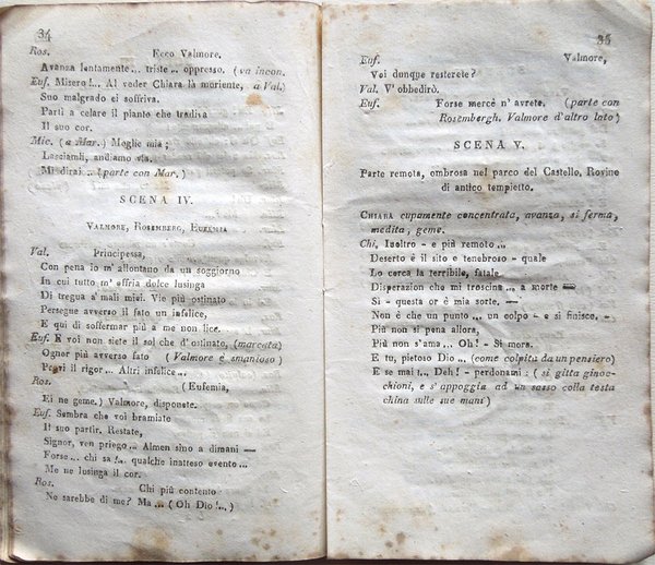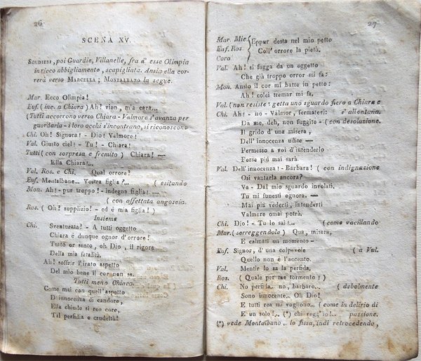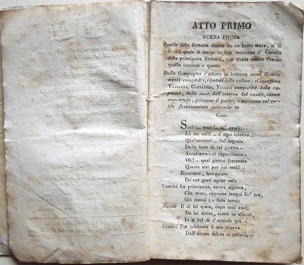 In-16° (17,4 x 10,4 cm), pp. 48, copertina editoriale con titoli entro cornice decorata alla prima di copertina ed elenco delle "Opere e Farse per Musica impresse, e vendibili da Pietro Bisesti Tipografo-Librajo in Via Nuova" alla quarta di copertina. Qualche segno d'uso e del tempo alla copertina, in particolare: piccole mende, ben sistemate con carta giapponese, e piccoli segni d'umido; alla prima di copertina, nella parte superiore, firma d'appartenenza e data, a inchiostro di mano coeva, e, nella parte centrale, parola, scritta, a matita viola, da mano successiva; nel margine superiore esterno della copertina posteriore, macchia color marrone. Al foglio con al recto il frontespizio, nel bordo superiore, strappo ben rimarginato con carta giapponese; alle pagine dalla 1 alla 6, leggero alone d'umido, che non giunge a toccare il testo; la macchia segnalata all'angolo superiore esterno della copertina posteriore, ha interessato, ovviamente nello stesso punto, anche le ultime pagine della pubblicazione, dalla 40 alla 48, con intensità e dimensioni che digradano dall'ultima verso le precedenti. Segni d'umido alle pagine, per il resto, in buono stato. Personaggi e interpreti: Eufemia, Principessa, moglie del Conte di Rosembergh, Lauretta Saini; Conte di Rosembergh, Angelo Boccomini; Chiara, di loro figlia, Annetta Fischer Maraffa; Marchese di Valmorre, Gio. Battista Genero; Montalbano, creduto padre di Chiara, Gaetano Antoldi; Michelotto, al servizio del Conte, Raffaele Scalese; Marcella, fattoressa, di lui moglie, Giuseppina Leva. Coro: Cavalieri, Vassalli, Contadine. Statisti: Gentiluomini, Guardie, Scudieri, Paggi, Domestici, Villici, Villanelle. L'azione, in un Principato sul Reno, nel Castello, e adiacenze, della Principessa Eufemia. Parole del sig. Gaetano Rossi. Musica del sig. Maestro Luigi Ricci. Gaetano Rossi (Verona 1774-1855), librettista e poeta, lavorò al teatro La Fenice di Venezia e fu direttore di scena in un teatro veronese. Scrisse circa cento libretti, tra i quali ricordiamo Tancredi e Semiramide, per Rossini, e Linda di Chamounix per Donizetti.