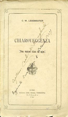 In-8°, pp. 195, brossura editoriale con titolo e piccola vignetta entro doppia filettatura. Firma di possesso del tempo al piatto, alla prima c. bianca e al titolo: 'Capitano Carlo De Margherita Reggimento Cavalleggeri di Catania (22°)'. Timbro di possesso del medesimo. Numerose sottolineature e annotazioni a matita del tempo. Discreto esemplare. Prima traduzione italiana di Clairvoyance, fortunata opera teosofica pubblicata in inglese nel 1899. Curiosamente, l'opera, volta a insegnare anche lo sviluppo delle proprie facoltà di chiaroveggenza, venne tradotta in portoghese dal grande Fernando Pessoa ('A clarividencia. Traducção de Fernando Pessoa', Lisbona, 1916). Il Leadbeater (Stockport, 1854Perth, 1934) fu il massimo esponente degli studi teosofici insieme con Annie Besant e con Helena Petrovan Blavatsky. Autore di numerosi libri sulle capacità extrasensoriali, nell'isola di Ceylon si fece buddhista, religione poi abbandonata per abbracciare la fede cattolica. Nel 1916 fu consacrato vescovo della Chiesa Cattolica Liberale, propaggine moderna della Chiesa vetero-cattolica di Utrecht che contava un migliaio di fedeli a Sidney; nel 1923 egli rientrò definitivamente in Australia, dove trascorse il resto della propria vita.<br>