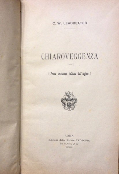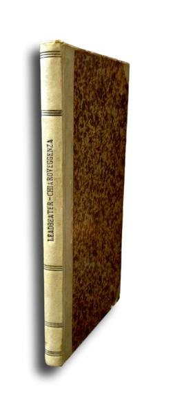 Edizione della Rivista Teosofia, Roma, 1902. Legatura in mezzo pergamino, con piatti cartonati e angoli, titolo al dorso, pp 195. Firma di possesso del tempo sulla prima pagina bianca, alcune sottolineature a matita leggera del tempo. Prima traduzione italiana di Clairvoyance, fortunata opera teosofica pubblicata in inglese nel 1899. Il Leadbeater (Stockport, 1854–Perth, 1934) fu il massimo esponente degli studi teosofici insieme con Annie Besant e con Helena Petrovan Blavatsky. Autore di numerosi libri sulle capacitˆ extrasensoriali, nell'isola di Ceylon si fece buddhista, religione poi abbandonata per abbracciare la fede cattolica. Nel 1916 fu consacrato vescovo della Chiesa Cattolica Liberale, propaggine moderna della Chiesa vetero-cattolica di Utrecht che contava un migliaio di fedeli a Sidney; nel 1923 egli rientr˜ definitivamente in Australia, dove trascorse il resto della propria vita.