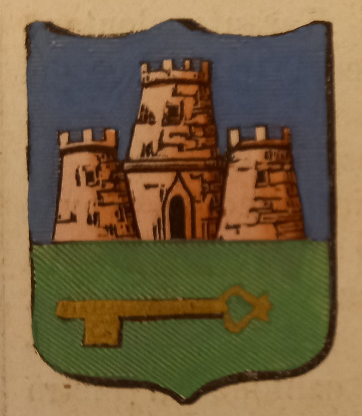 Piccolo stemma comunale colorato a mano d’epoca (cm. 3,8 x 3,2 ca.). Stralcio dal Dizionario Corografico illustrato dell’Italia, edito a Milano nel 1868. Ogni stemma di questa raccolta è inserito in una o più pagine di testo con la descrizione della località, notizie storico - geografiche e statistiche (numero degli abitanti e degli elettori, guarnigioni della Guardia Nazionale, ecc.). Spesso il testo è redatto da studiosi locali o dai sindaci, con maggiori, interessanti notizie.