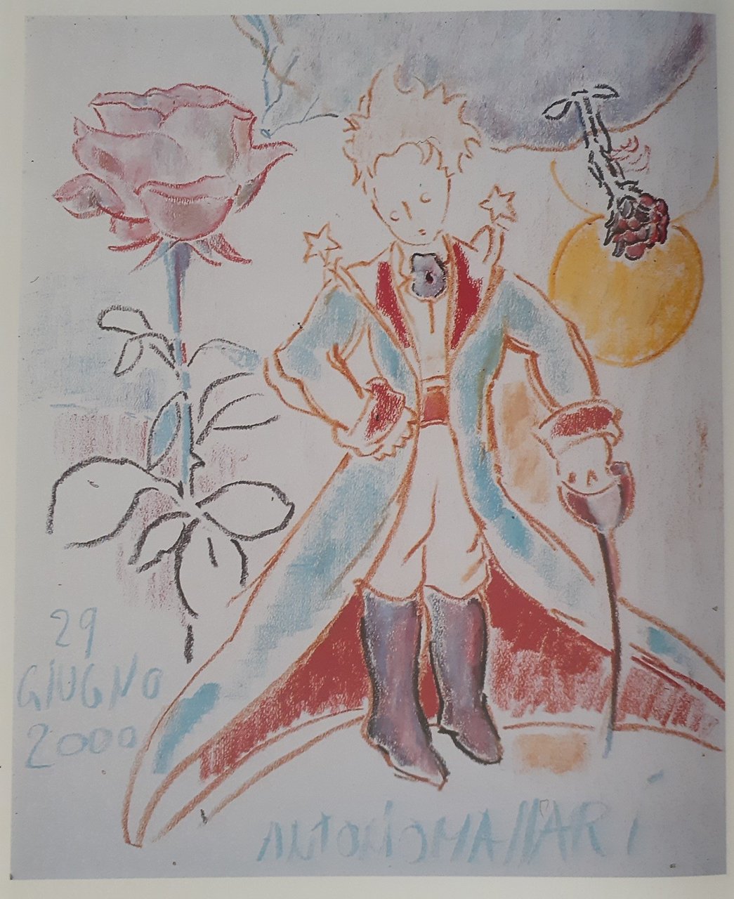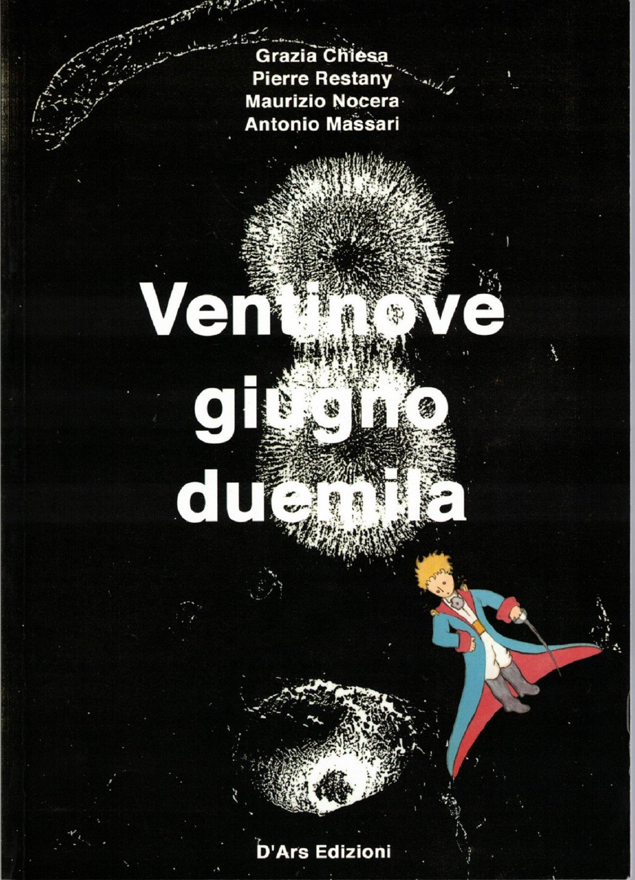 Grazia Chiesa et al., Ventinove giugno duemila, D’Ars Edizioni, s.l. (ma stampato a Verdello, presso la Tipografia Gamba) 2001, pp. 58, ill. b.n. e col., cm 29, br. ed. Testi in italiano e francese. Autori: Grazia Chiesa, Pierre Restany, Maurizio Nocera, Antonio Massari. Pubblicazione realizzata in occasione del primo centenario della nascita di Antoine de Saint-Exupéry. Il volume, di grande formato, raccoglie testi in prosa e poetici e un ricco apparato iconografico riproducente per lo più opere di Antonio Massari tutti dedicati al tema del Piccolo Principe. Minime fioriture al taglio superiore, per il resto perfetto.