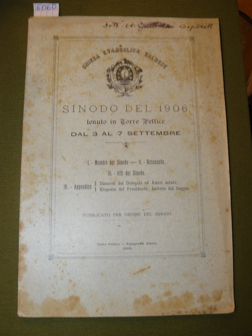 Chiesa Evangelica Valdese. Sinodo del 1906 tenuto in Torre Pellice dal 3 al 7 settembre. I - Membri del Sinodo. II - Resoconto. III - Atti del Sinodo. IV Appendice: Discorsi dei Delegati ed Amici esteri; Risposte del Presidente; Lettere del Seggio. Pubblicato per ordine del Sinodo