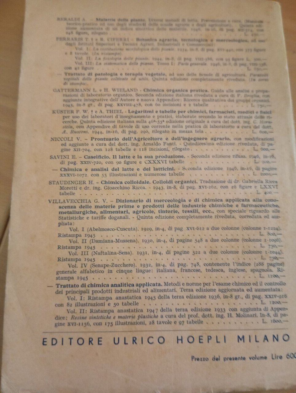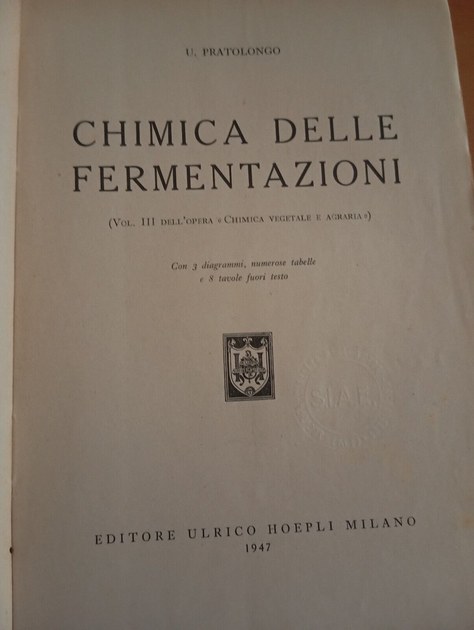 Chimica delle fermentazioni, U. Pratolongo, Hoepli, 1947, per collezionisti