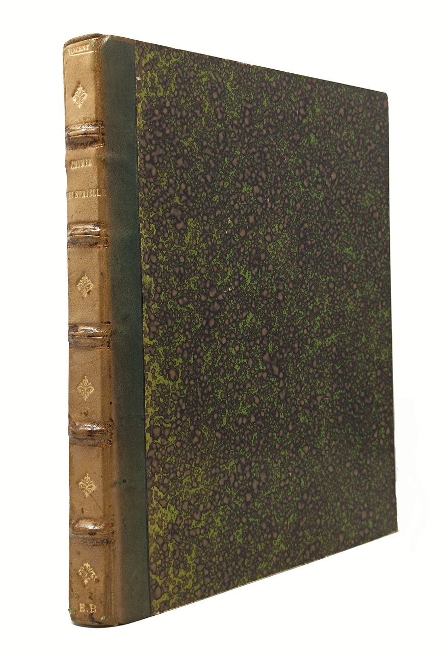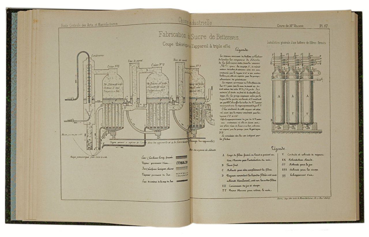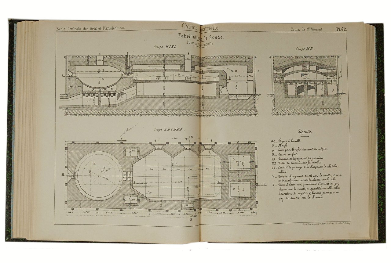 Raccolta composta da 80 tavole a stampa, rilegate in un unico tomo di dimensioni 23,5 x 28 cm circa. Le tavole fanno riferimento al corso di chimica industriale tenuto presso l'Ecole Centrale des Arts et Manufactures' dal Prof. Vincent. Non datato ma presumibilmente risalente alla fine dell'800 (le varie analisi e le raccolte di dati ripiportati nelle tavole sono tutte datate tra il 1880 e il 1892). Le tavole sono divise per argomenti riconducibili alla fabbricazione dello zucchero, al nero animale (carbone), l'acido solforico, l'estrazione del sale dell'acqua del mare, la fabbricazione della soda, la fabbricazione dell'acido carbonico, la fabbricazione del cloro, l'industria del potassio, l'industria dell'ammoniaca, il gas per l'illuminazione. Ciascuna tavola è stampata su due pagine frontali (ad eccezione di due taole più volte piegate su se stesse). Il retro delle tavole è bianco. A parte l'eccezione di alcune tavole, in cui sono riportate delle semplici tabelle, la maggior parte riporta disegni tecnici dei macchinari utilizzati per le varie laorazioni, con didascalie stampate in carattere corsivo. Ogni tavola è numerata. Lingua del testo: francese. Stato di conserazione: sull'ultima tavola sono presenti vistose macchie, due o tre scritte e disegnini sul retro di alcune tavole ma, nel complesso, un esemplare decisamente buono. Copertina cartonata rigida con rivestimento marmorizzato e dorso in pelle. Titoli e fregi in oro e nervi in rilievo sul dorso.